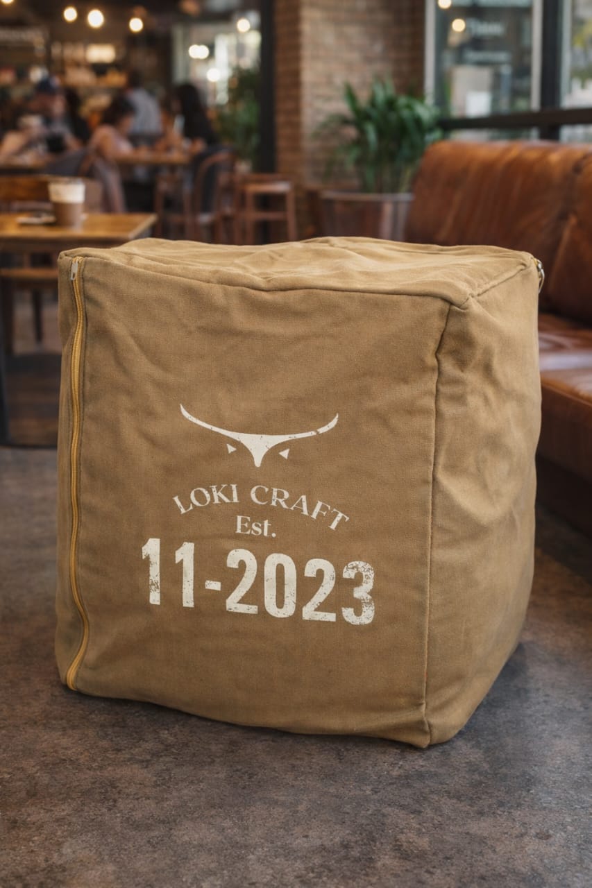 The Indiana Cube Shape Bean Bag boasts a vintage look and is made of high-quality cotton fabric in a warm sand yellow color. Perfect for any home, this 16x16 inch bean bag comes without fill and features the iconic Loki Craft logo screen printed on the front. Please note, this product is not water resistant.