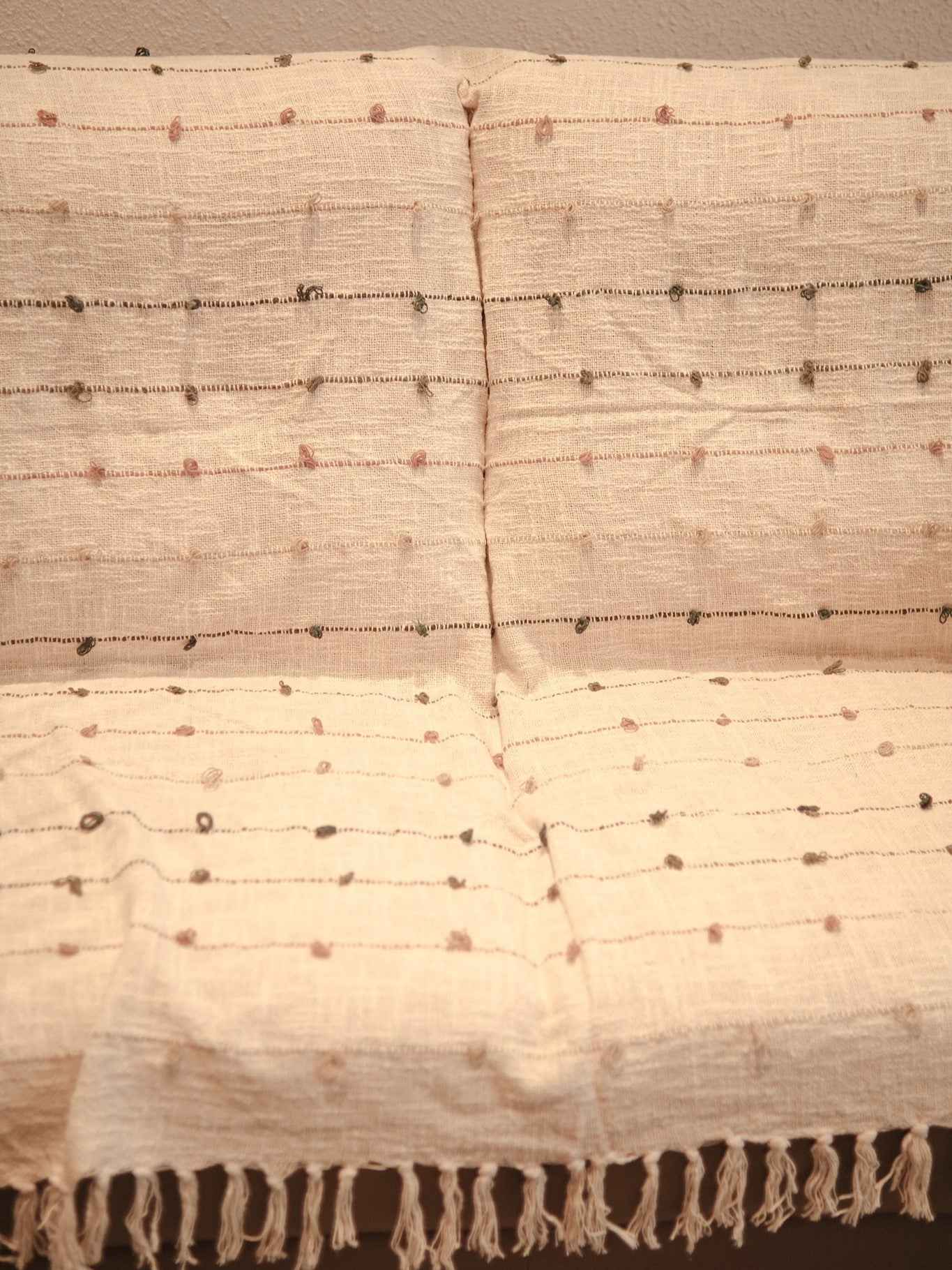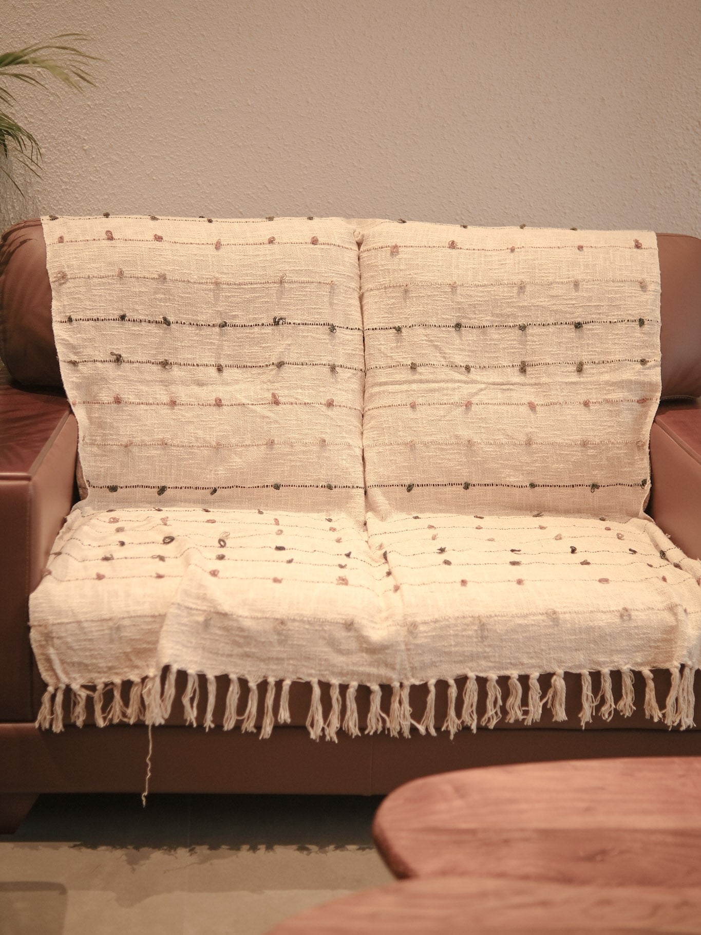 Wrap your space in earthy elegance with the Tarita Handwoven Sofa Throw, crafted from 100% natural cotton. This handcrafted piece features subtle multicolored tufted dots woven into a soft beige base, creating a soothing pattern that blends perfectly with modern, rustic, or bohemian interiors.
