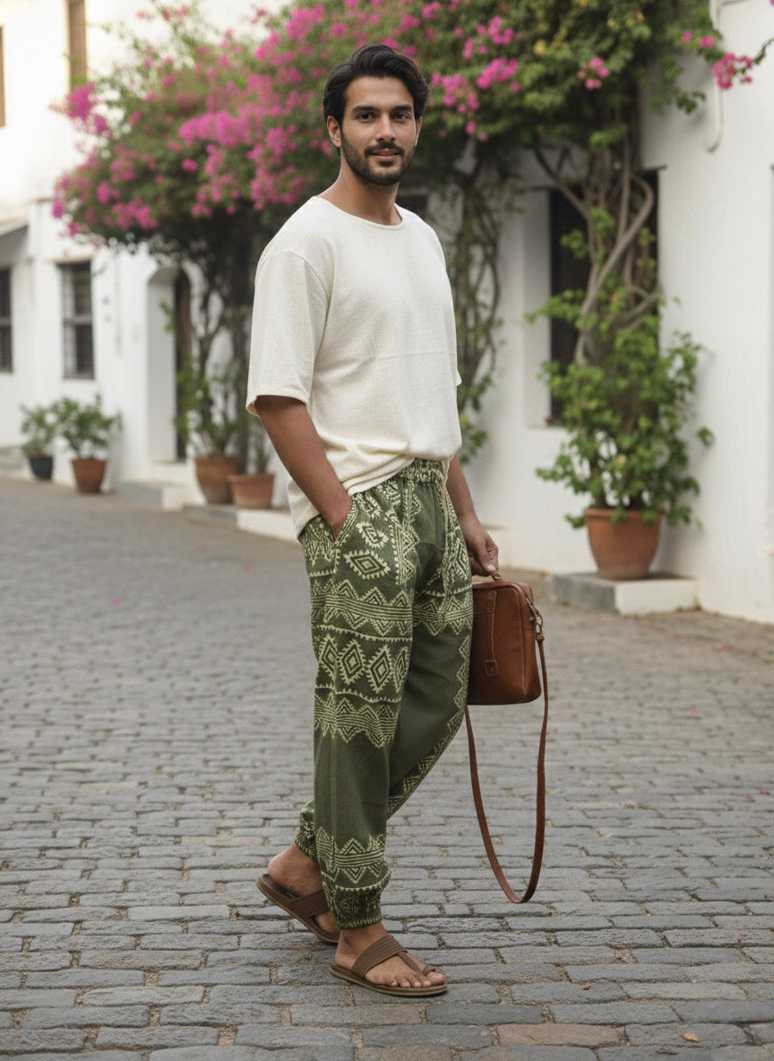 Inspired by traditional Indian textile motifs and relaxed coastal living, these olive green harem pants blend heritage patterns with modern comfort. The all-over geometric tribal print draws from age-old weaving symbols, reimagined in a soothing earthy palette that feels both grounded and contemporary.