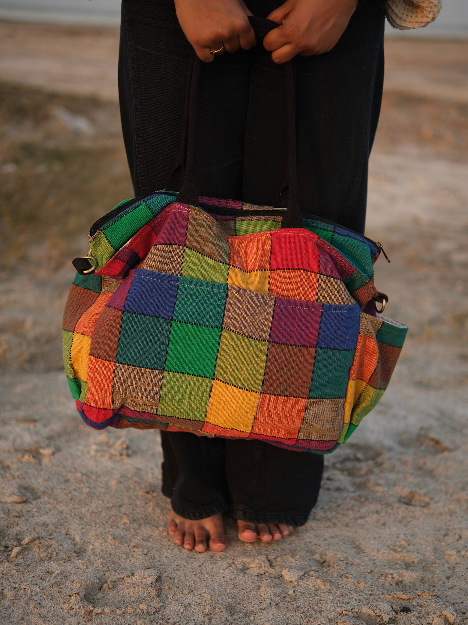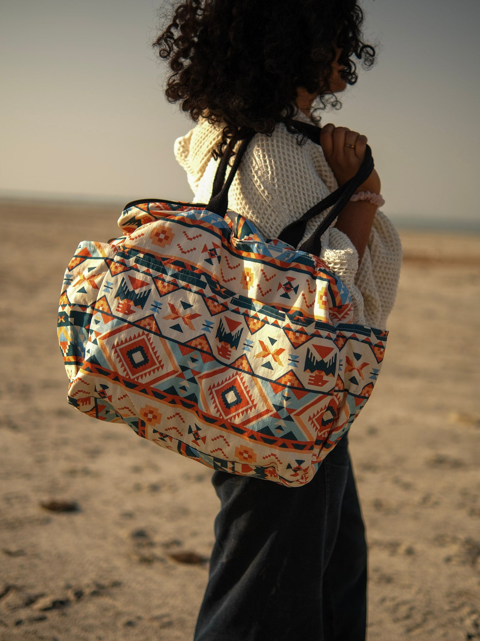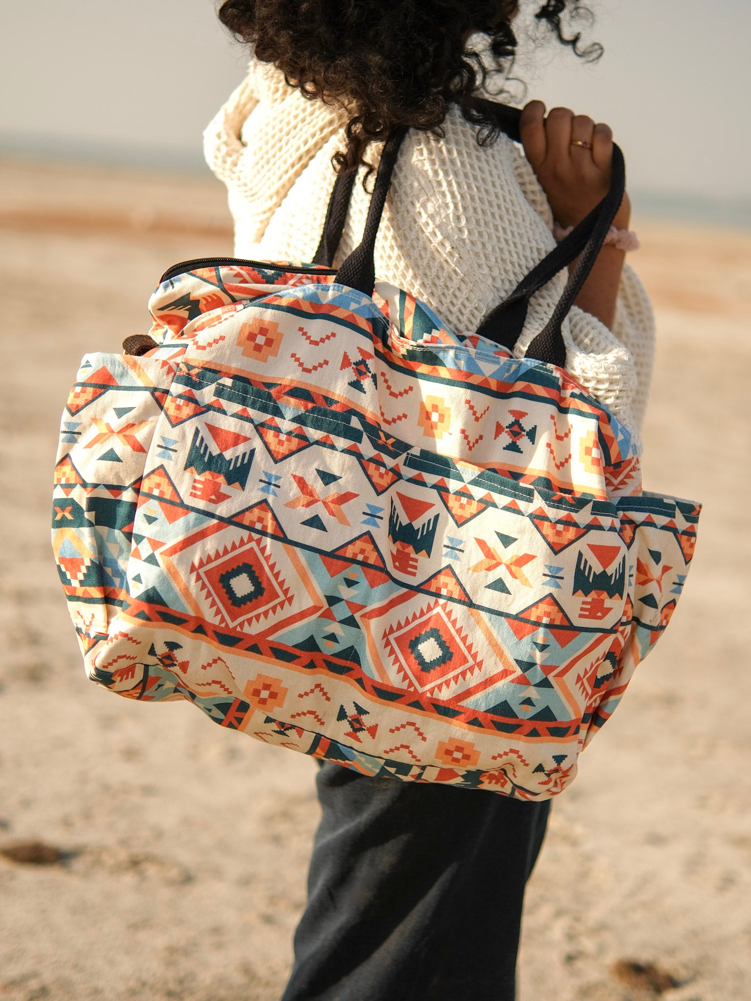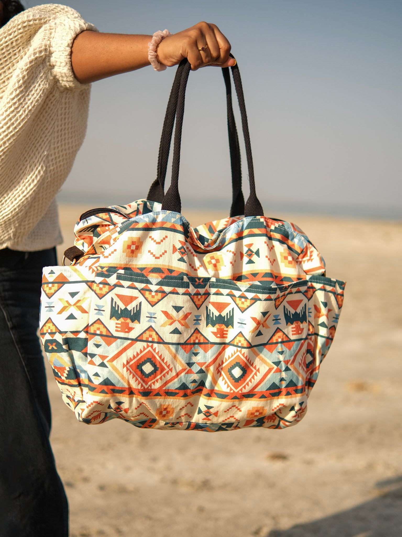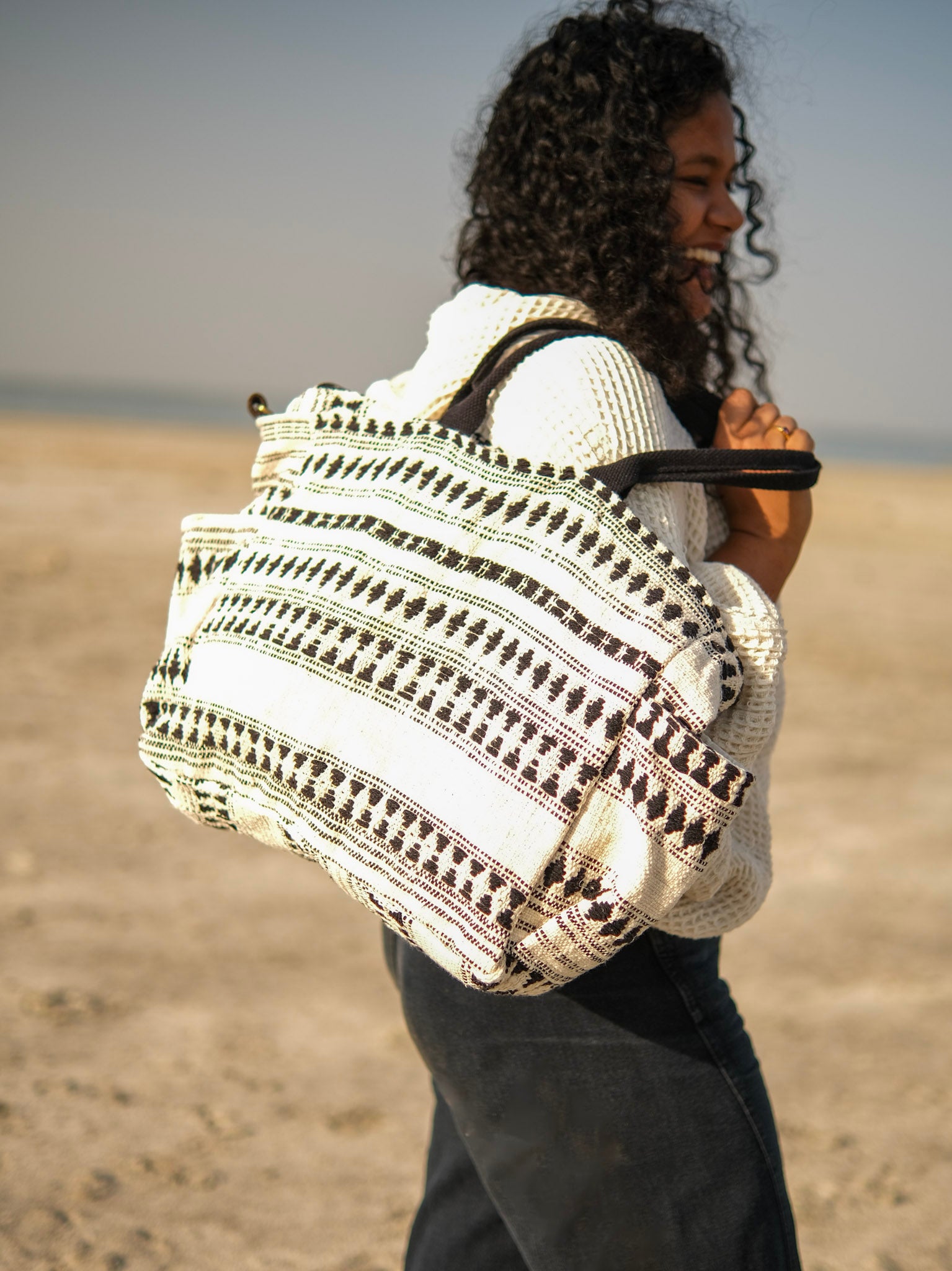 The Aaravi Handwoven Tote Bag is a perfect fusion of utility and craftsmanship. Made from durable handwoven cotton fabric featuring intricate tribal-inspired patterns, this spacious tote offers both style and practicality. Its sturdy handles and roomy interior make it ideal for everyday errands, market visits, travel, or beach days. Designed to complement both casual and earthy looks, this bag captures a free-spirited, artisanal essence.