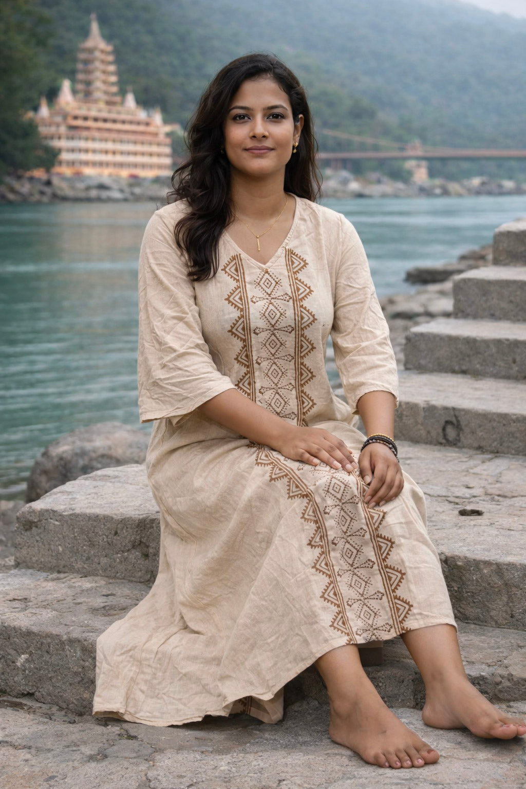 This elegant hand block printed dress reflects timeless craftsmanship and effortless grace. Featuring a beautifully detailed vertical motif panel, each design is carefully stamped by hand, making every piece unique with subtle variations that celebrate artisanal work.