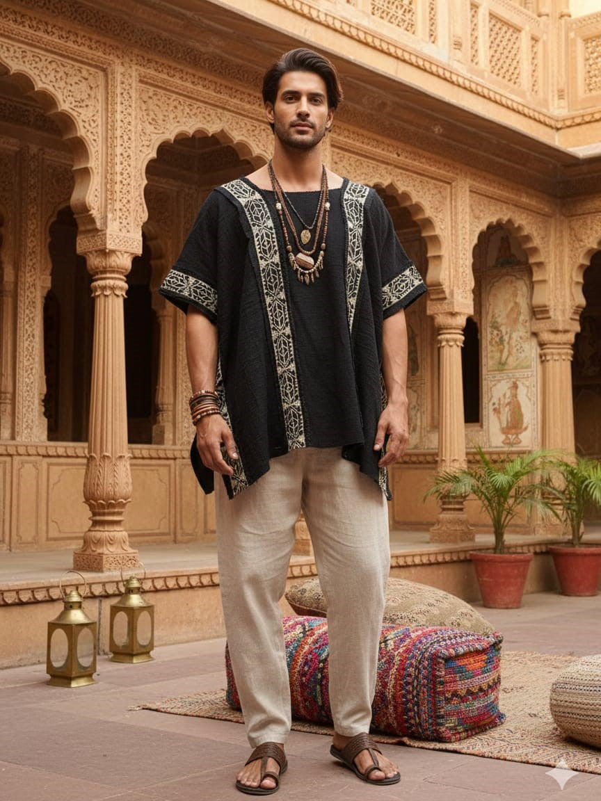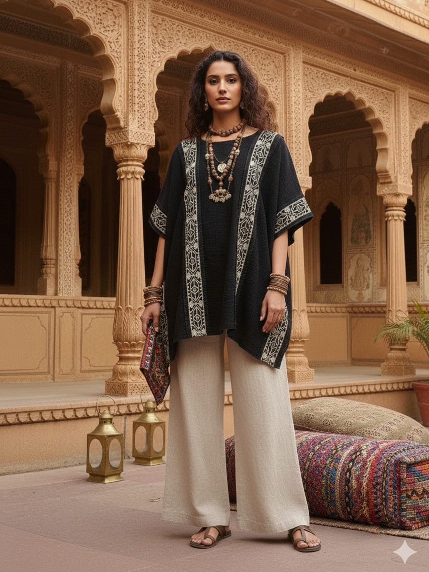 Embrace effortless elegance with the Aarini Boho Tribal Border Poncho, a free-flowing artisanal layer crafted for those who love comfort with character. This poncho features beautifully woven tribal-inspired borders that add definition and charm to its relaxed silhouette. The draped fit makes it perfect for layering over tops, dresses, or bralettes, offering a statement-making boho look without compromising on ease.