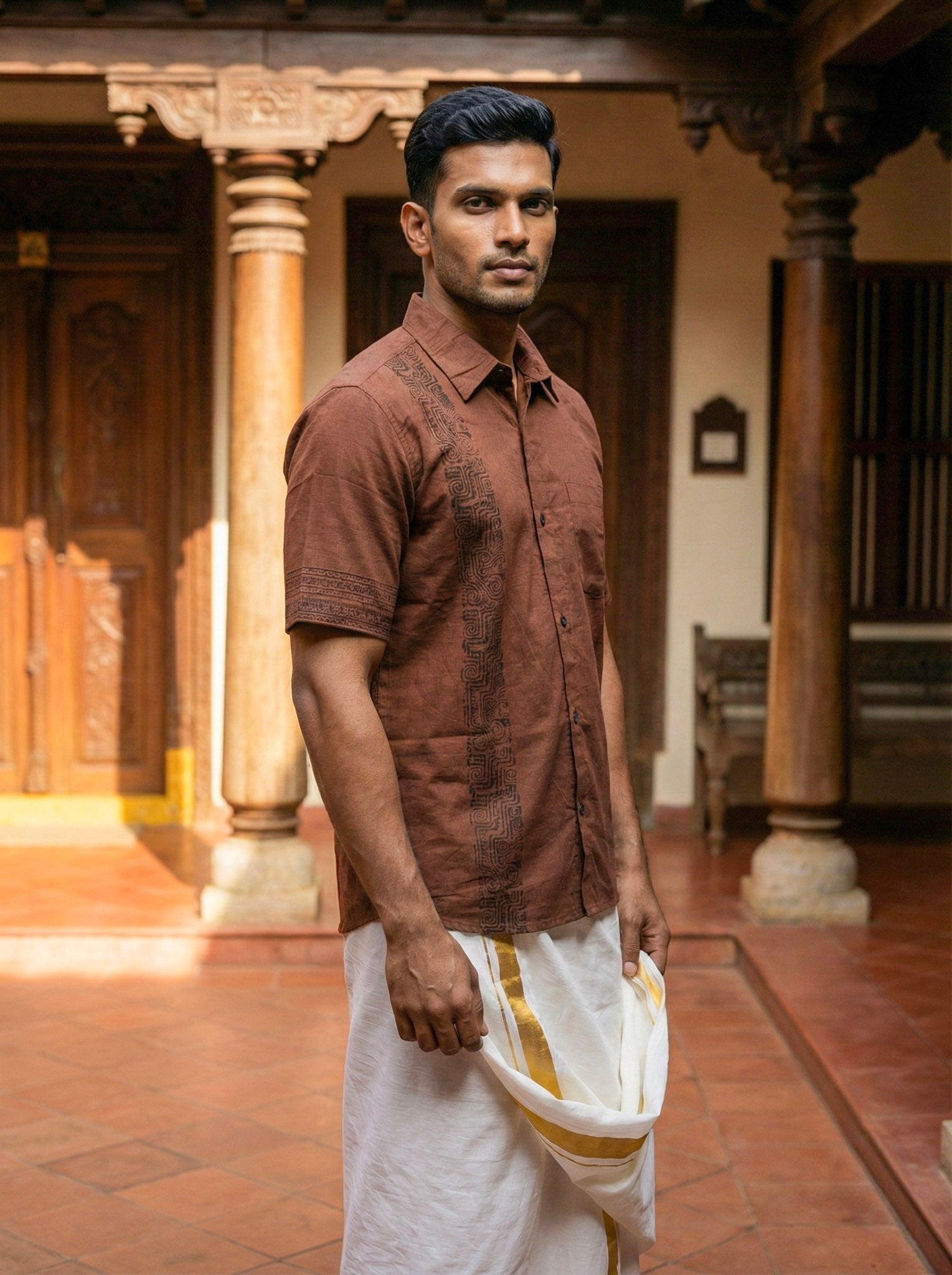 Designed with a classic collar, short sleeves, and a relaxed tailored fit, Arka pairs effortlessly with dhotis, linen trousers, or chinos for a balanced contemporary-ethnic look.