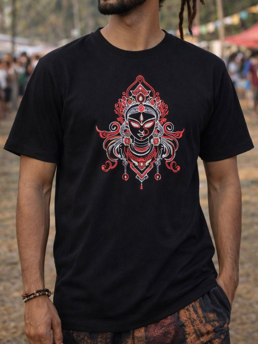 The front features a powerful Devi-inspired artwork in striking red and white tones that transforms under UV light, glowing