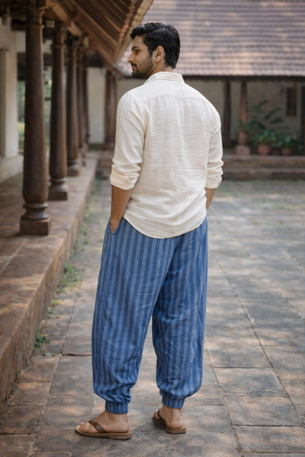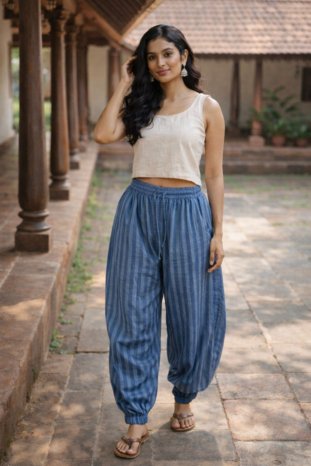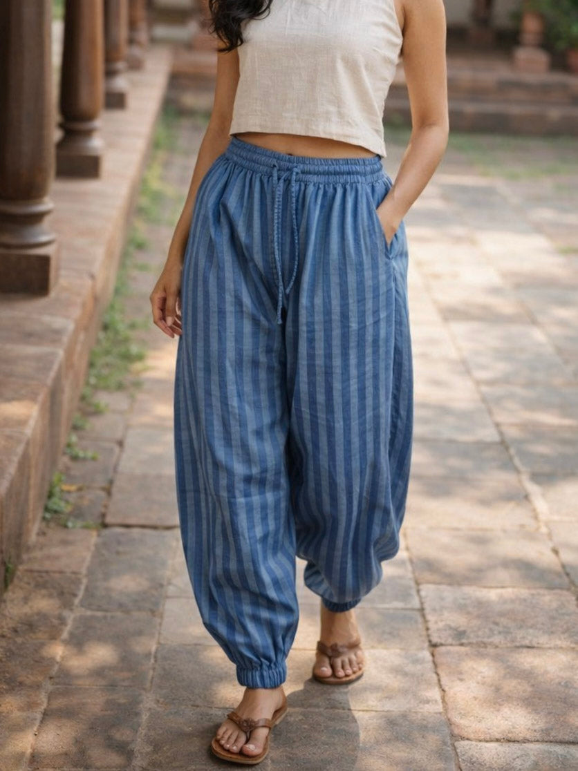 Effortless and breathable, the Dhara Harem Pants are crafted for slow days and soulful movement. Made from soft, lightweight cotton, these pants feature subtle indigo-blue vertical stripes inspired by traditional Indian handloom patterns. The relaxed harem silhouette, elasticated waistband with drawstring, and gently gathered ankles offer all-day comfort with a flattering drape.