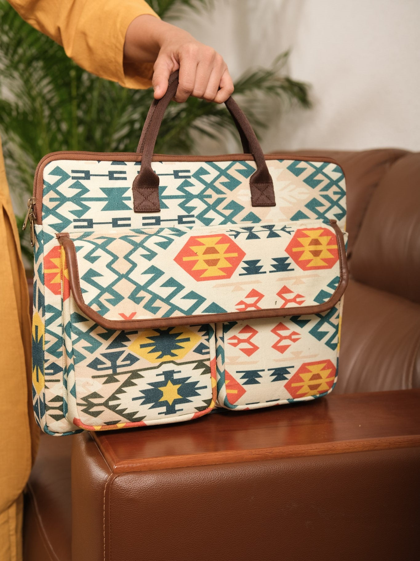 Rooted in indigenous artistry and designed for modern utility, the GeoTribal Laptop Bag brings together bold tribal geometry and everyday functionality. Crafted from durable cotton canvas, the bag features striking geometric and symbolic motifs inspired by traditional tribal patterns found across India’s craft heritage.