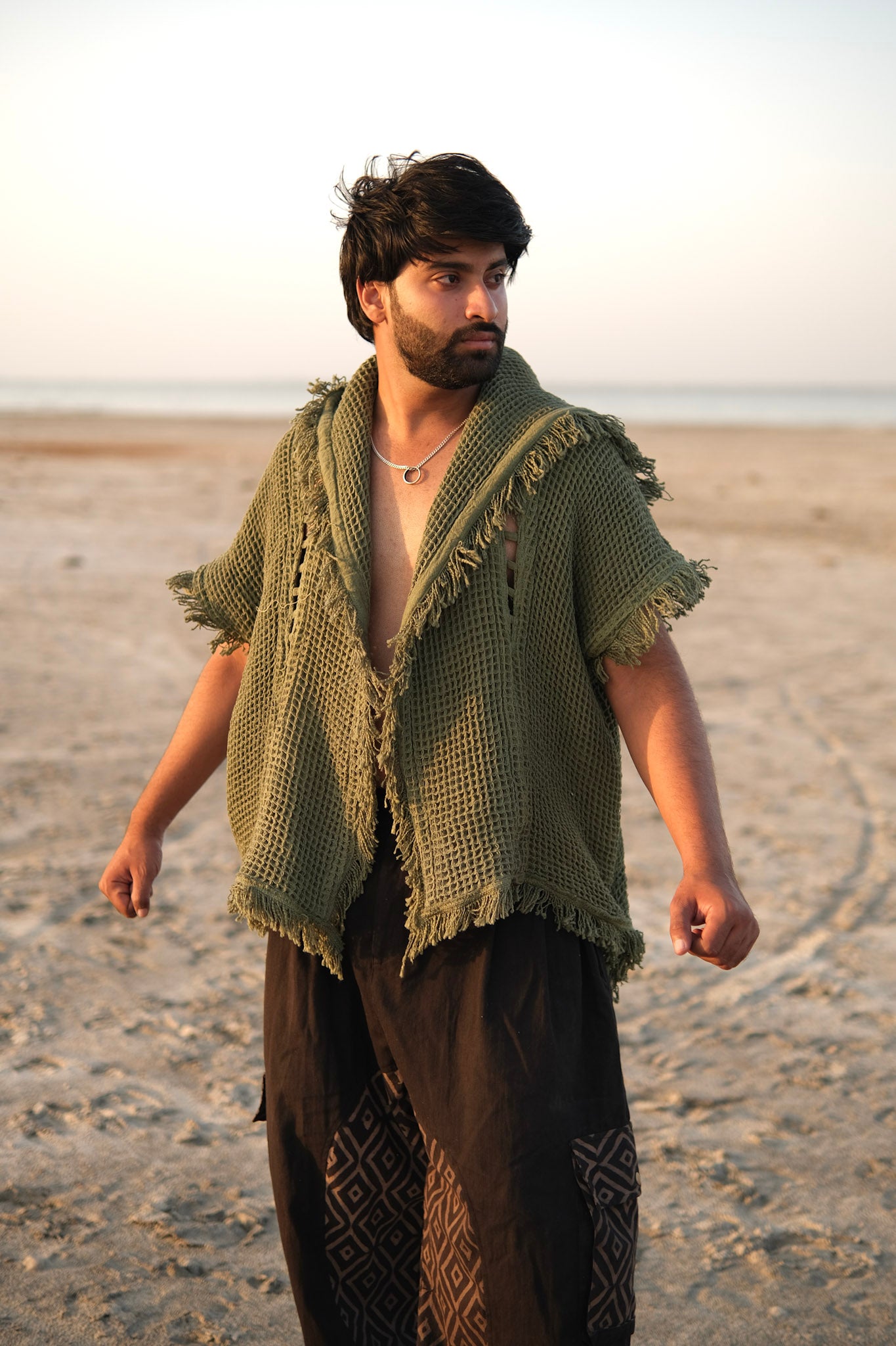 The rugged raw-edge fringing and open-cut sides give it a bold tribal look, perfectly suited for dancers, performers, and wanderers who love to stand out.