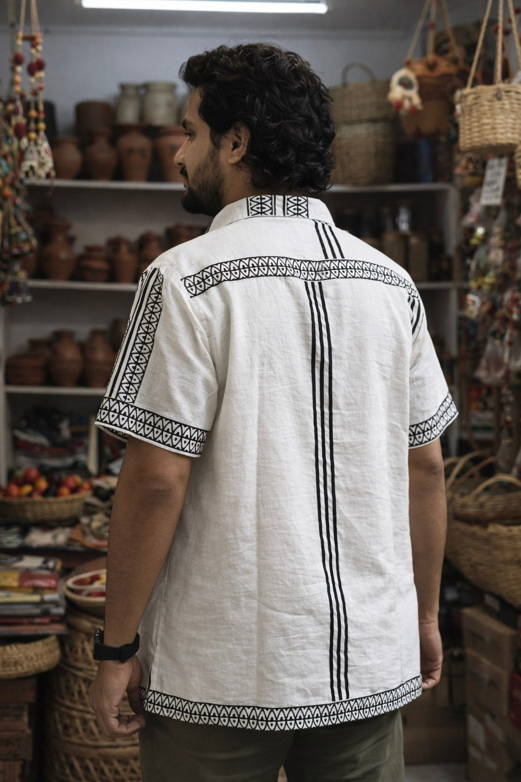 Inspired by timeless Indian tribal geometry and slow-crafted traditions, this handcrafted cotton shirt blends minimal design with bold ethnic detailing. The crisp white base is accented with striking black tribal stripe motifs, creating a balanced look that feels both contemporary and rooted in heritage.