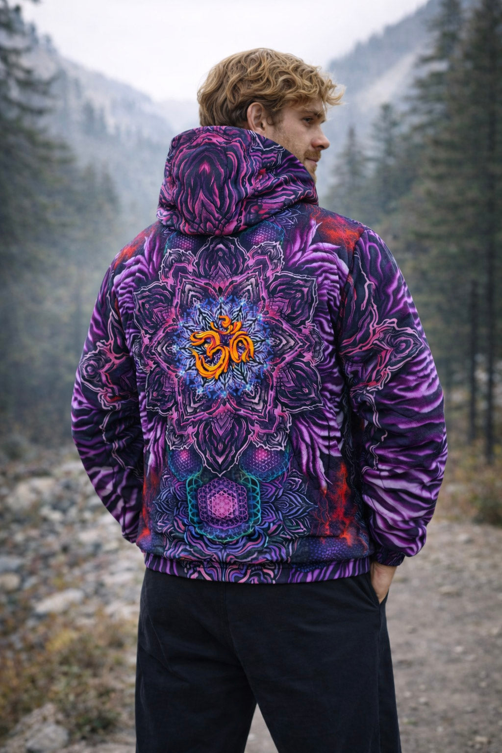 This vibrant zip-up hoodie features a bold digital print with a large, intricate mandala design on both the front and back. A bright orange sacred symbol sits at the center of the psychedelic purple and pink patterns, creating a striking visual focus. Designed for comfort and style, the jacket includes a practical hood, a smooth front zipper, and ribbed elastic cuffs to ensure a cozy and relaxed fit.