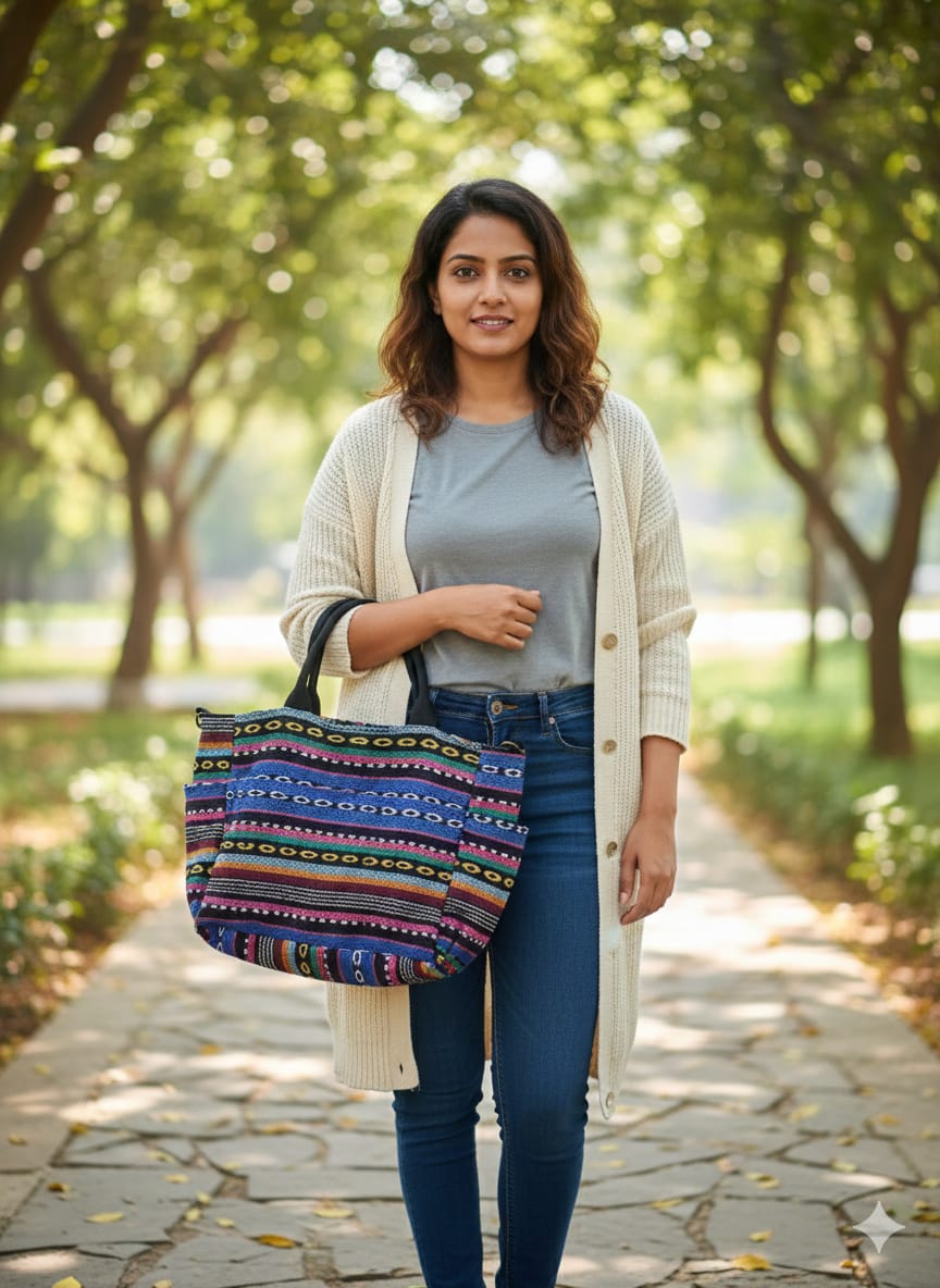 The Naya Boho Tribal Tote Bag is a perfect fusion of utility and craftsmanship. Made from durable handwoven cotton fabric featuring intricate tribal-inspired patterns, this spacious tote offers both style and practicality. Its sturdy handles and roomy interior make it ideal for everyday errands, market visits, travel, or beach days. Designed to complement both casual and earthy looks, this bag captures a free-spirited, artisanal essence.