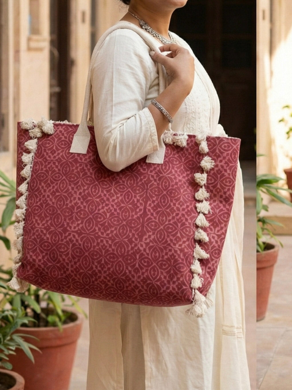 The Rasa Bloom Handblock Tote Bag is a graceful blend of everyday utility and timeless craftsmanship. Made from durable cotton fabric, this tote features delicate handblock-inspired floral motifs layered across a warm rose-madder base, creating a soft yet striking visual appeal.