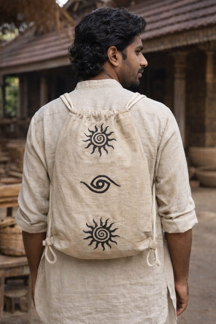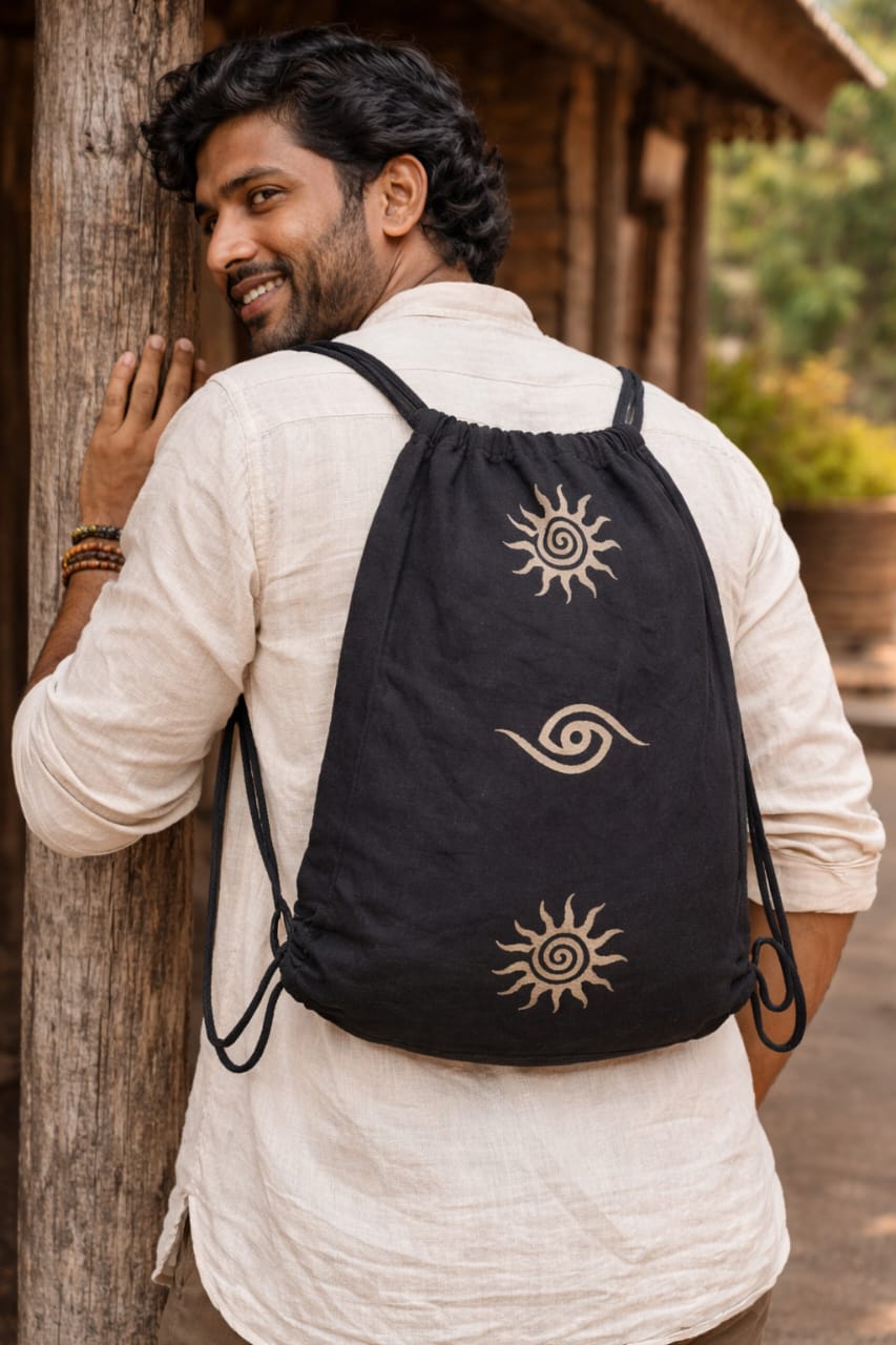Minimal, earthy, and full of character — this handblock printed drawstring bag is designed for effortless everyday carry. Featuring symbolic sun and spiral motifs, it reflects traditional artistry with a modern nomad touch.