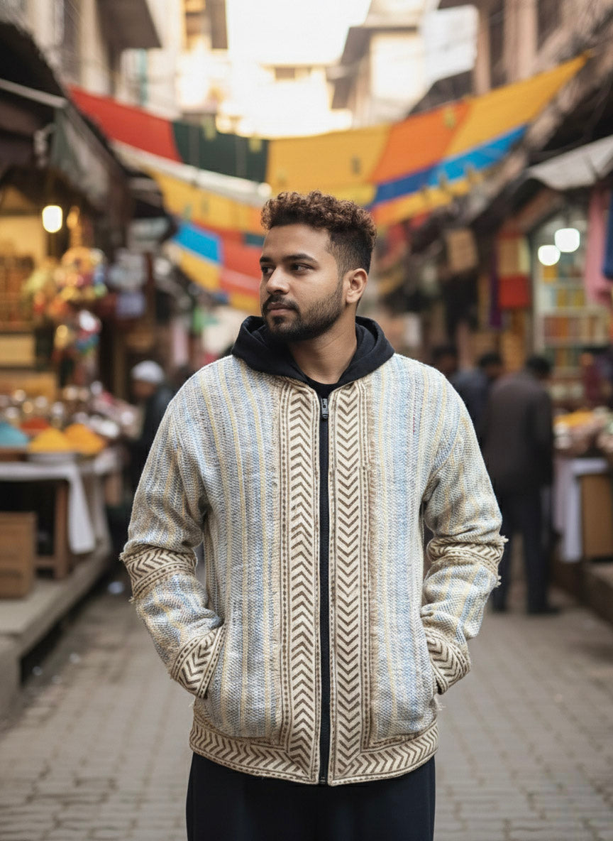 Inspired by the timeless charm of Indian bazaars and desert craftsmanship, this jacket blends traditional tribal patterns with modern street style. The earthy tones, vertical woven textures, and bold geometric borders reflect age-old handloom aesthetics seen across Rajasthan and Gujarat, reimagined for contemporary wear.