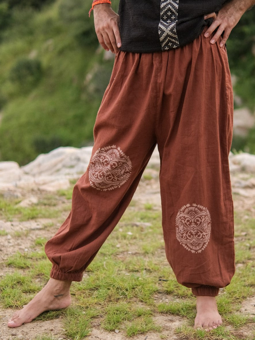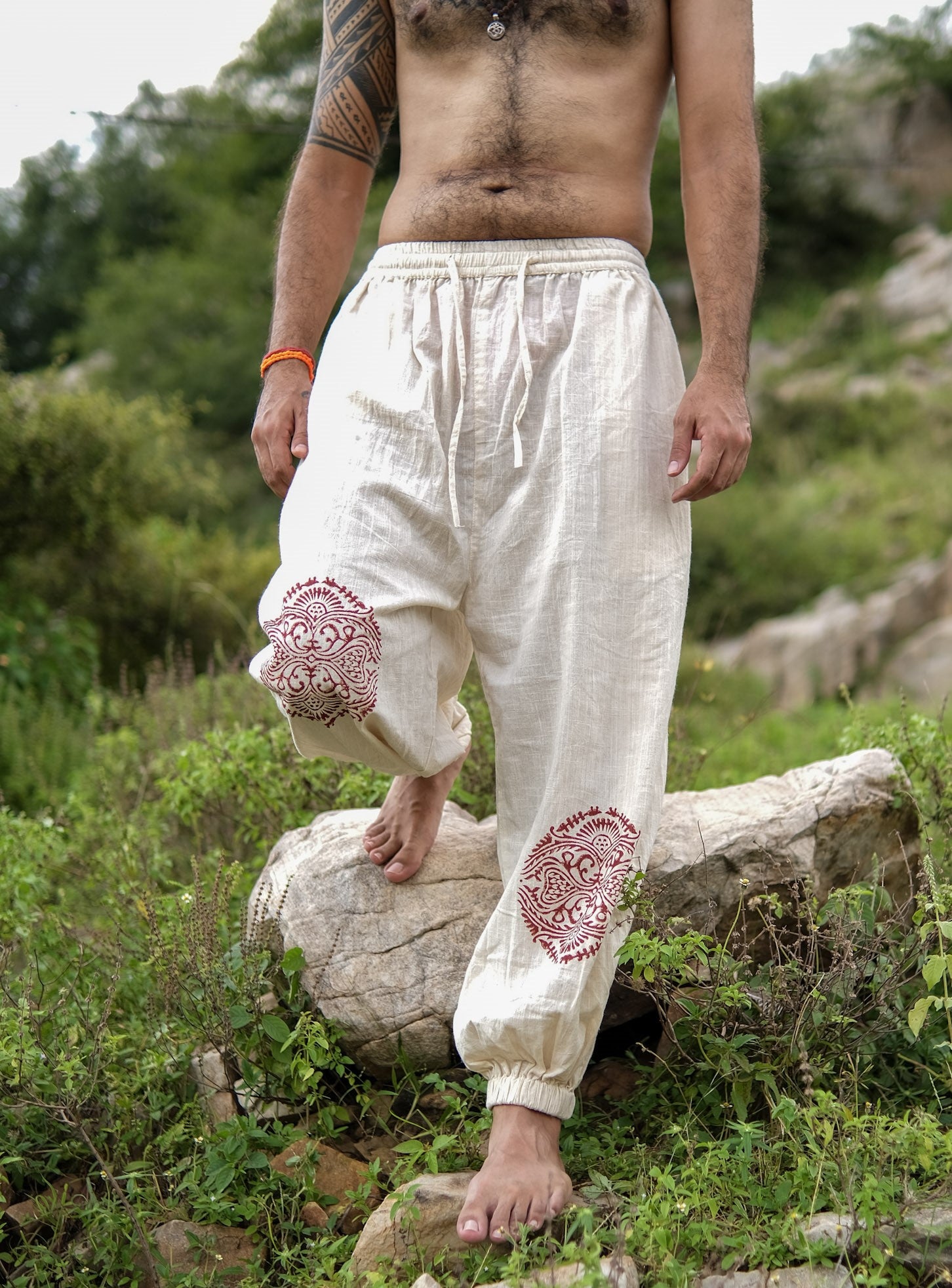 Beige Cotton Boho Pants with Red Tribal Mandala Print