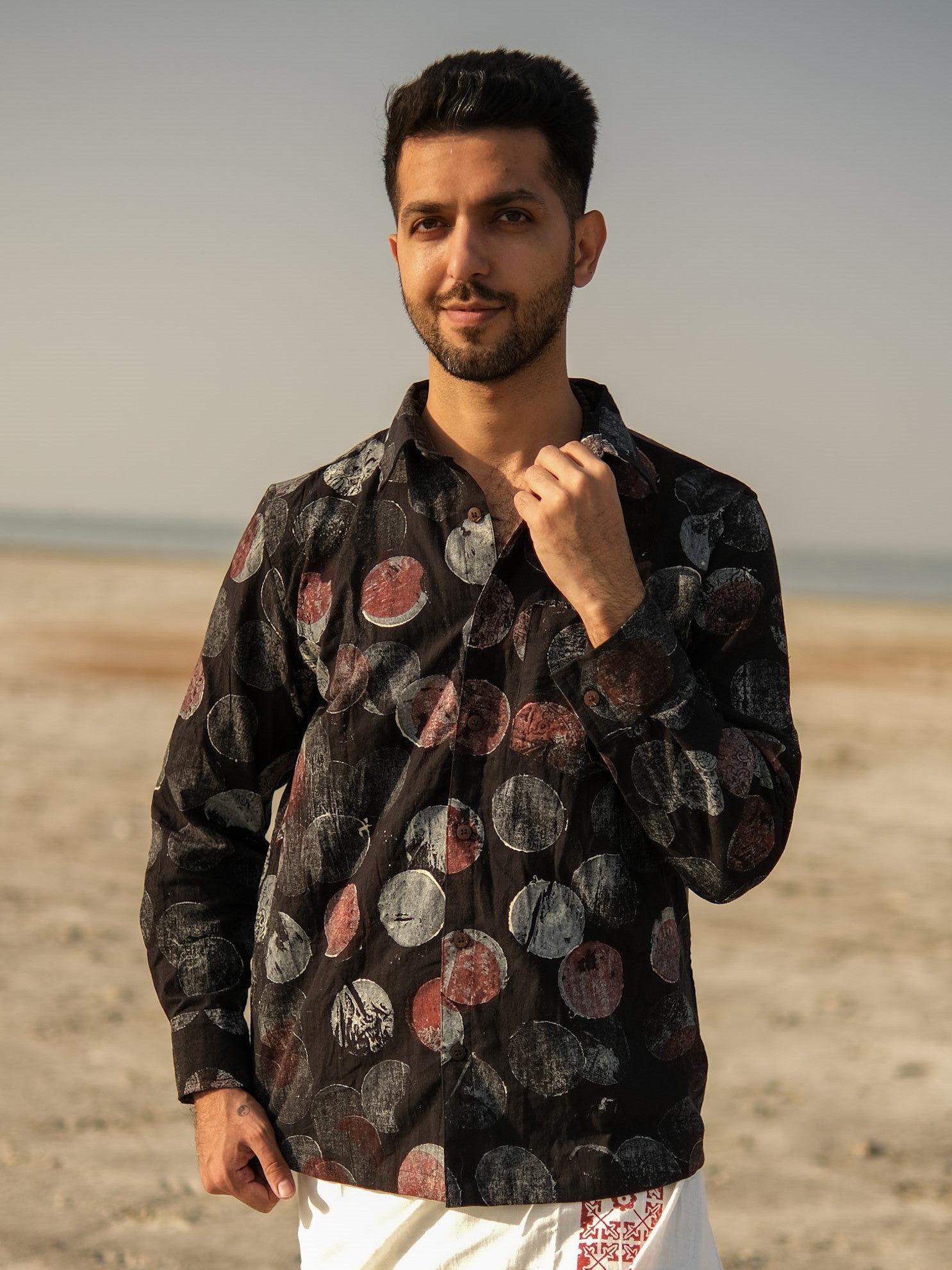 Discover the art of subtle statement fashion with our Aarush Polka Block Print Shirt, a blend of earthy tones and handcrafted heritage. Made from pure cotton, this shirt features traditional hand block-printed circular motifs on a deep black base — each mark telling a story of artisan craftsmanship from Rajasthan.