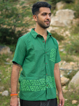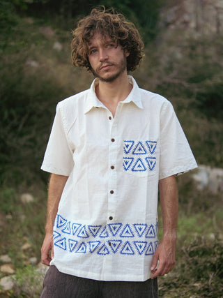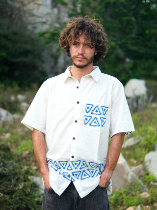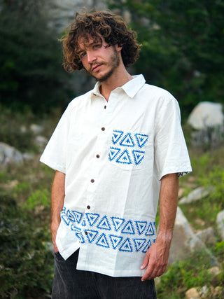The Tridha Shirt Tribal Handblock Cotton Shirt blends traditional craftsmanship with a contemporary boho flair. Crafted from soft, breathable cotton, it features hand-blocked geometric tribal patterns that add a unique, artisanal touch. Ideal for warm weather, travel, and festive occasions, this shirt ensures comfort without compromising style, making it a versatile addition to any wardrobe seeking earthy sophistication.