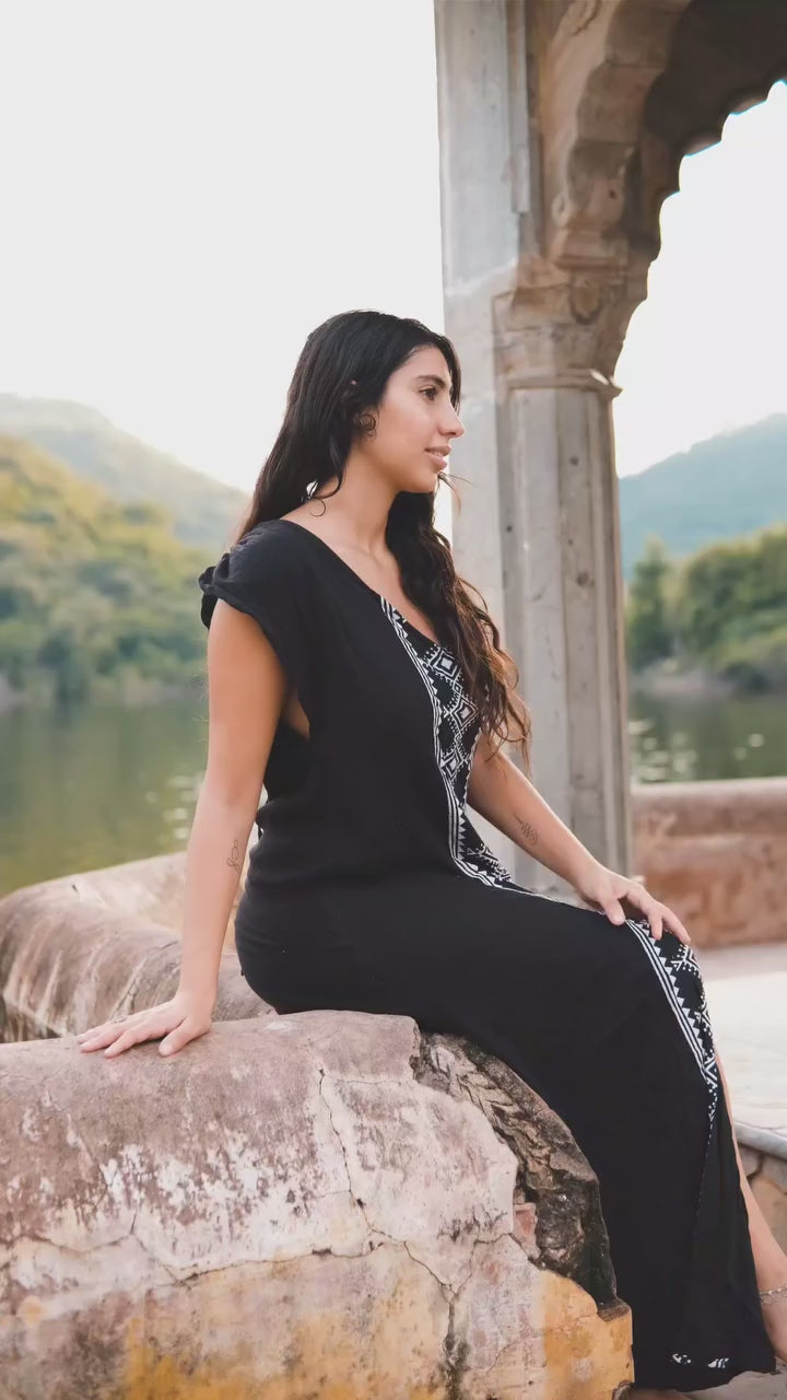 Let your inner goddess shine in the Narmada Maxi Dress! Crafted from cozy cotton gauze with a one-of-a-kind crinkle texture, this dress boasts a magnificent Rajasthani hand block print on the front. Plus, the adjustable drawstring on the back ensures a flawless fit for all sizes, up to 38 inches in bust. Prepare to catch eyes with this charming and chic goddess-inspired dress. (Model's bust: 32 inches). From the creative mind of designer Shilpa Sivadas