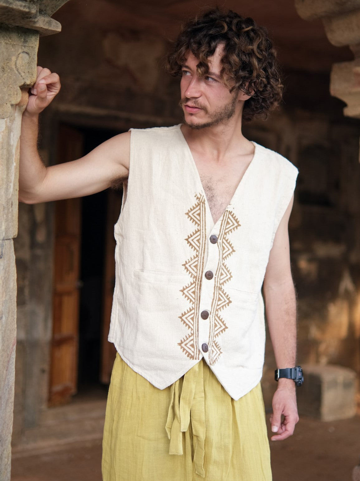 Add some fun, style, and comfort to your wardrobe with the Satya Vest. This new vest design features a beautiful block print that adds class and uniqueness. The sleeveless and v-neck shape make it extra comfortable and perfect for any occasion. Get ready to stand out with its minimal but stylish block design.