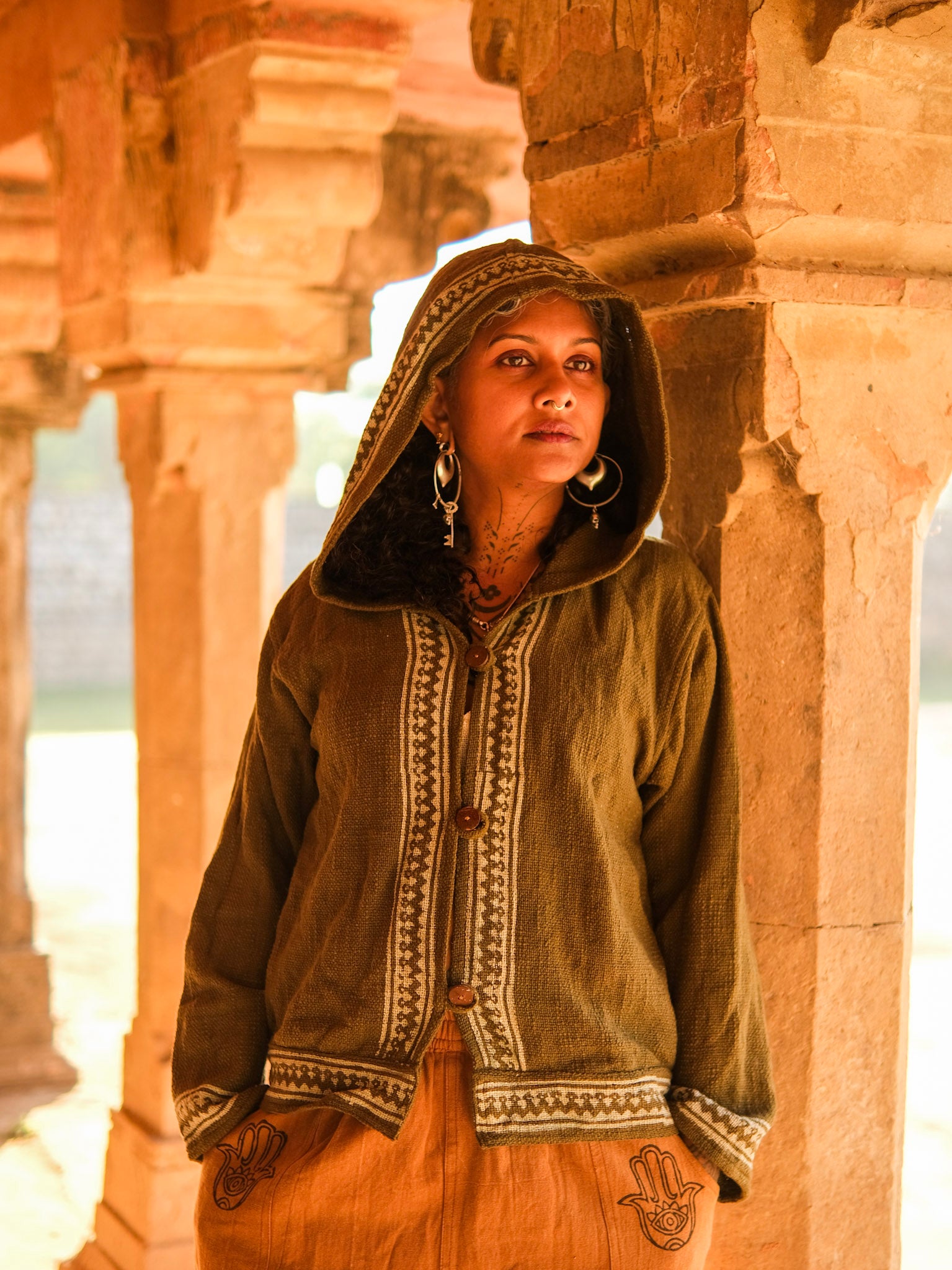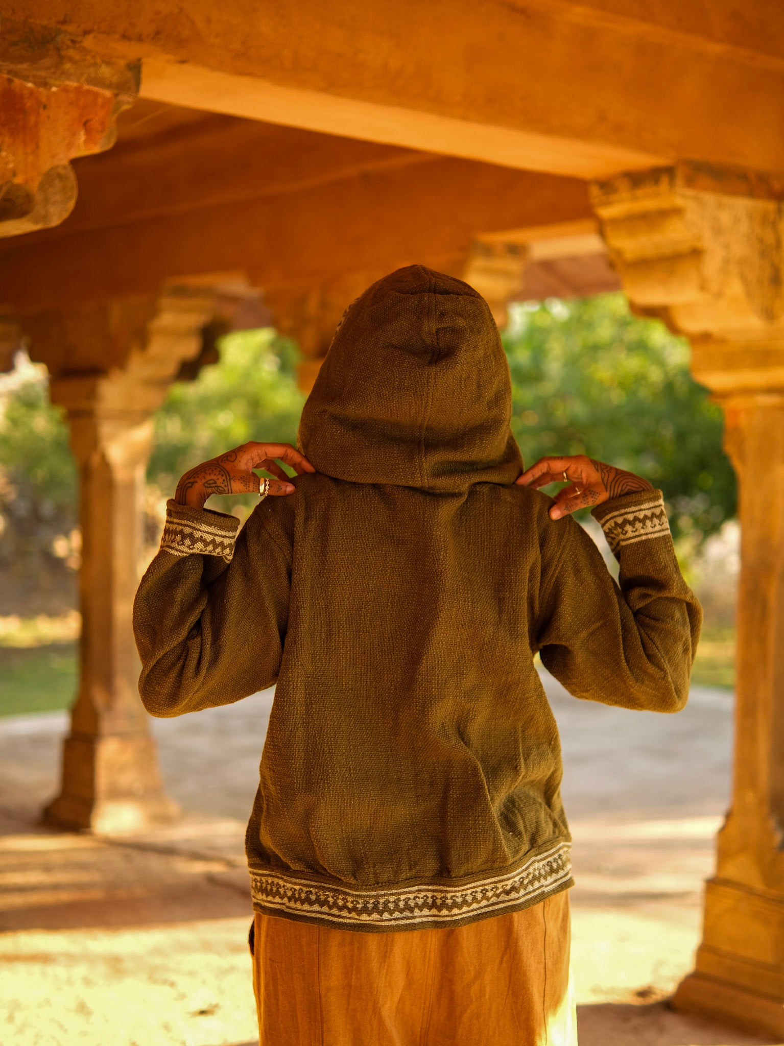The Aarunya Tribal Handwoven Hoodie is a perfect blend of comfort, tradition, and earthy boho charm. Crafted from thick, handwoven cotton, this hoodie features intricate tribal-inspired borders on the sleeves, hem, and front placket. Designed with a relaxed fit and a cozy hood, it carries the warmth of artisanal craftsmanship while offering everyday practicality.
