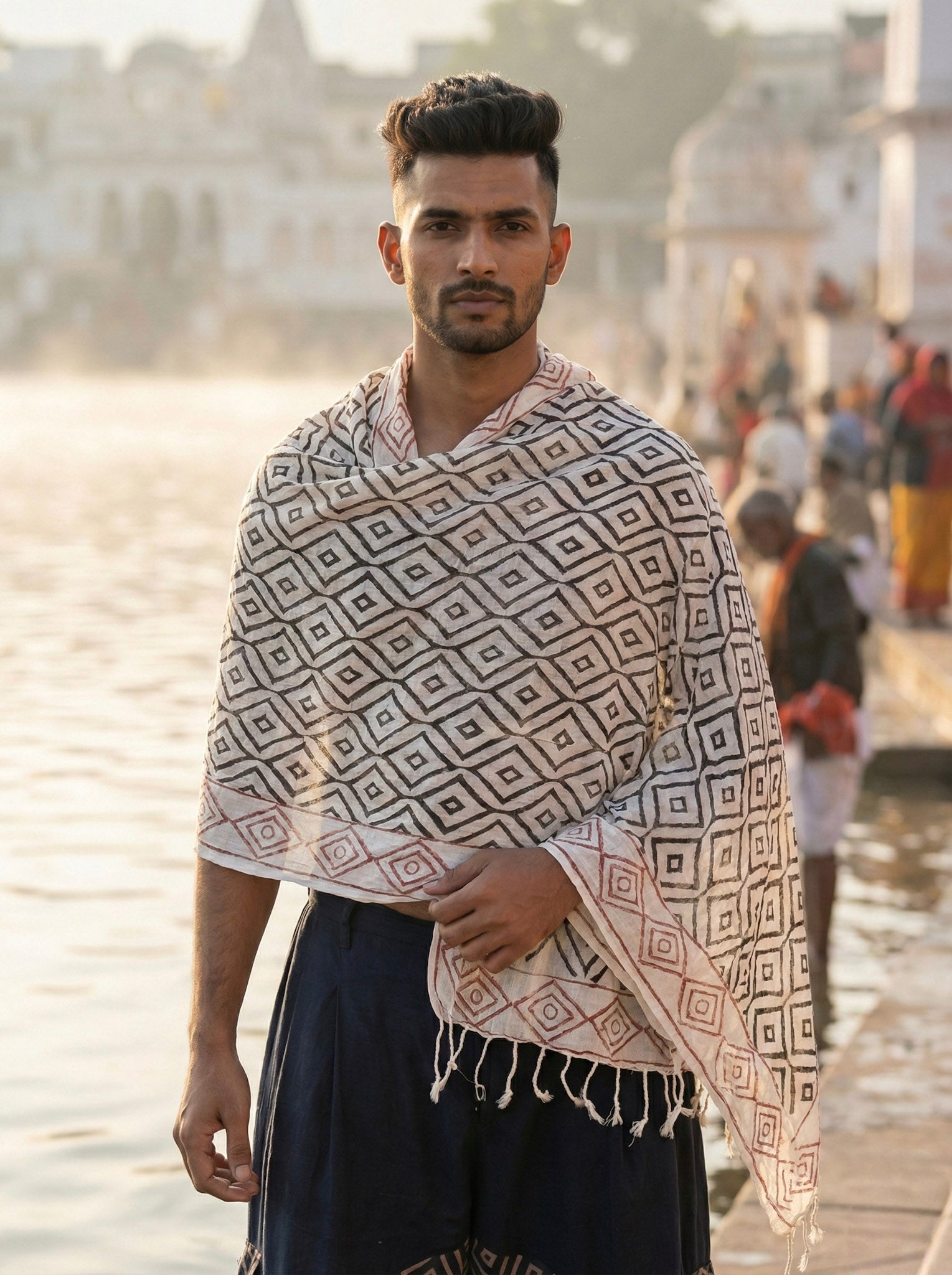 Rooted in Indian craft traditions, this Sudha Sarong is a timeless expression of minimal elegance. Crafted in lightweight, breathable cotton, the sarong features an all-over diamond geometric motif, hand-printed in earthy black tones—reminiscent of age-old block patterns found across Rajasthan and river-side ghats.