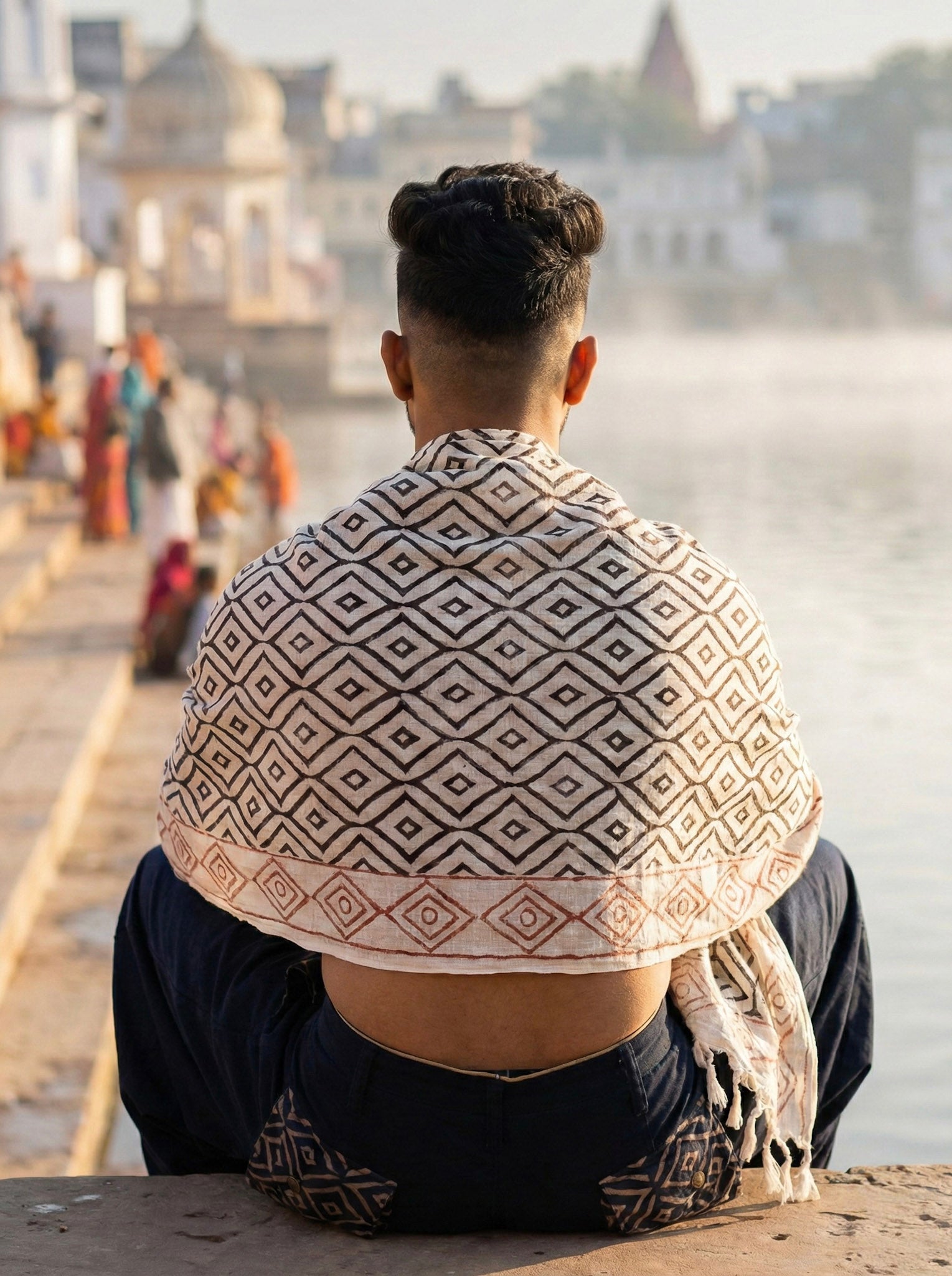 Photographed by the river at golden hour, this piece embodies the calm rhythm of Indian life—where tradition meets contemporary style.