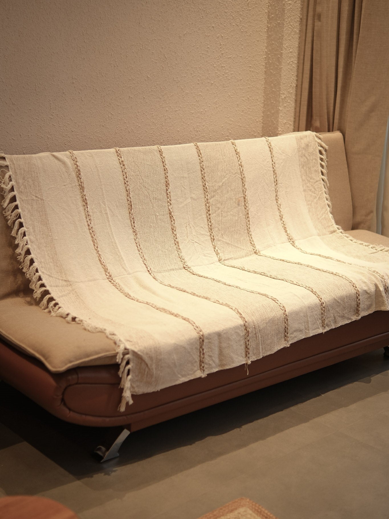 Elevate your living space with the Aarunya Handwoven Cotton Sofa Throw, a beautifully crafted décor piece that blends artisan workmanship and relaxed bohemian style. Made from premium hand-woven cotton, this throw features a textured weave and subtle ethnic detailing that adds depth and character to any room.