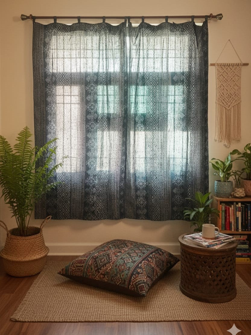 Dress your windows with style and soul with the Aranya Blockprint Curtain. Handcrafted from soft cotton and printed using traditional blockprinting techniques, this curtain brings a blend of bohemian aesthetics and artisan heritage into your home.