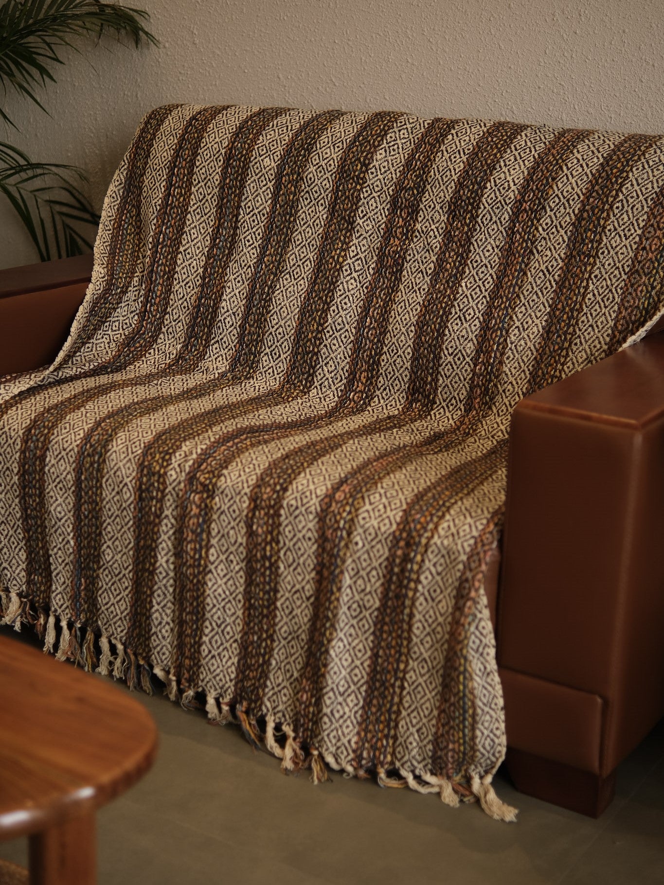 Bring a warm, grounded aesthetic to your living space with the Kavya Handwoven Tribal Stripe Sofa Throw. Crafted by skilled artisans, this throw features a stunning mix of earthy browns, beige tones, and traditional diamond-stripe patterns that add character and depth to any room.