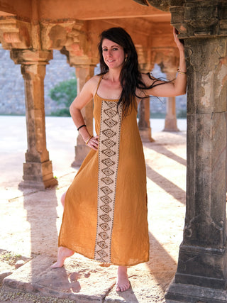 Feel the boho vibes in this fabulous Manasa Maxi Dress! Crafted from premium cotton, it features a stunning sand yellow color and a gorgeous Rajasthani hand block print patch. Experience the artistry of Indian craftsmanship while embracing an organic, free-sized boho aesthetic! Go green and be seen in sustainable style.