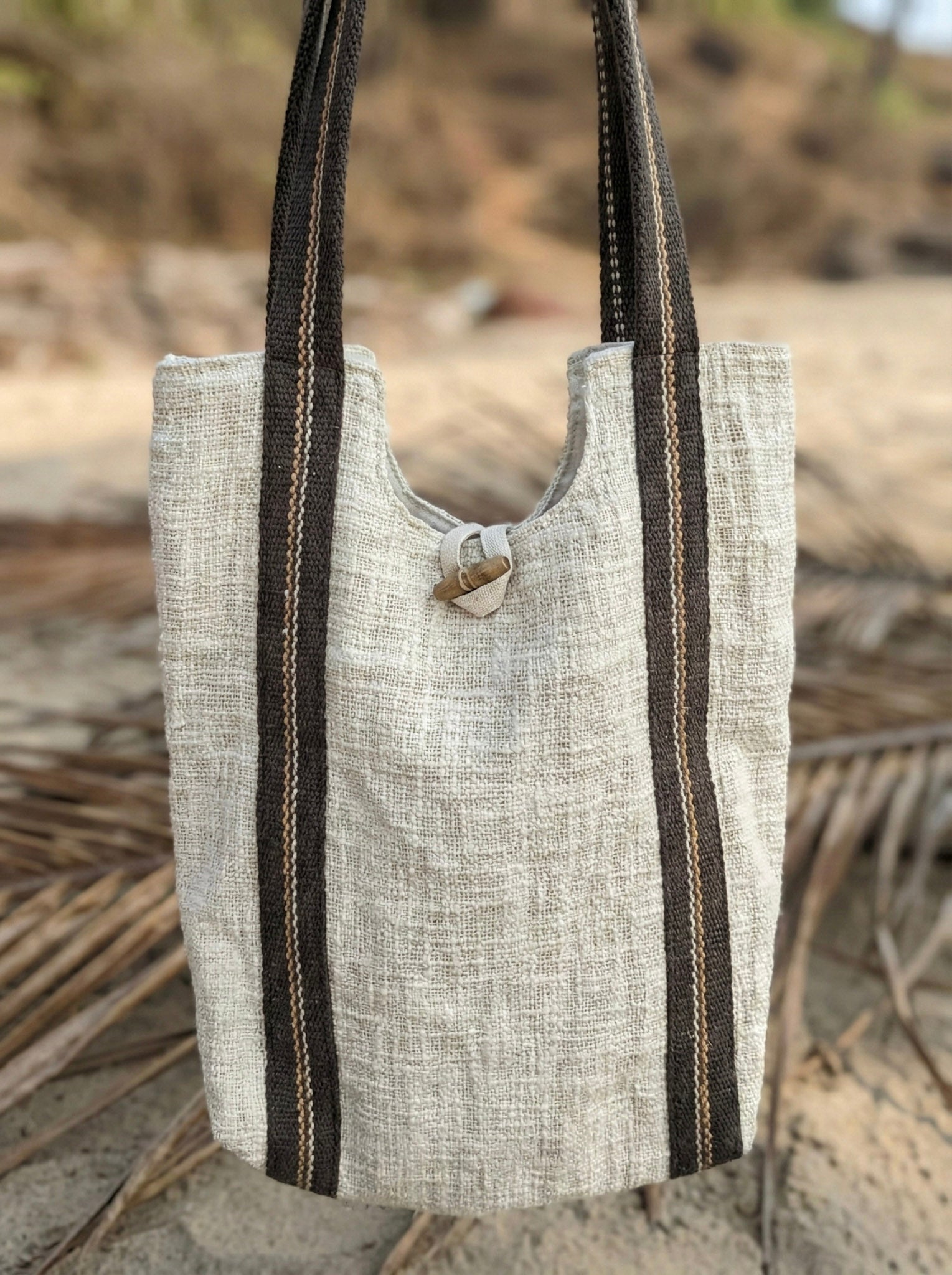 Designed for versatility and comfort, the Pranav Tote Bag is lightweight yet spacious—ideal for yoga sessions, beach walks, market visits, or everyday essentials. The wooden toggle loop closure adds a subtle handcrafted detail while keeping your belongings secure.