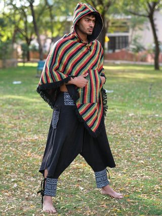 Get ready to jam in our Rasta Poncho! Made with cotton jacquard fab and featuring rastafari color stripes, this hoodie poncho is perfect for any bohemian rapsody. With playful fringes on the hem and a double layer design with viscose inside, this poncho is both funky and functional.