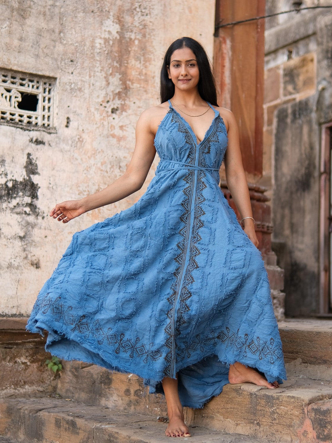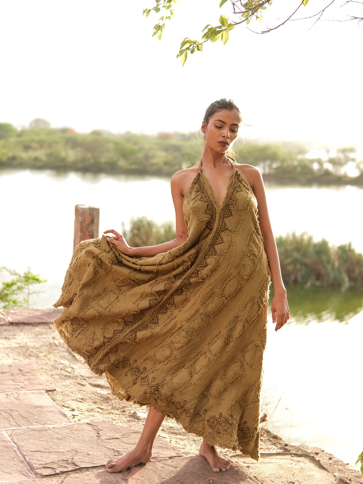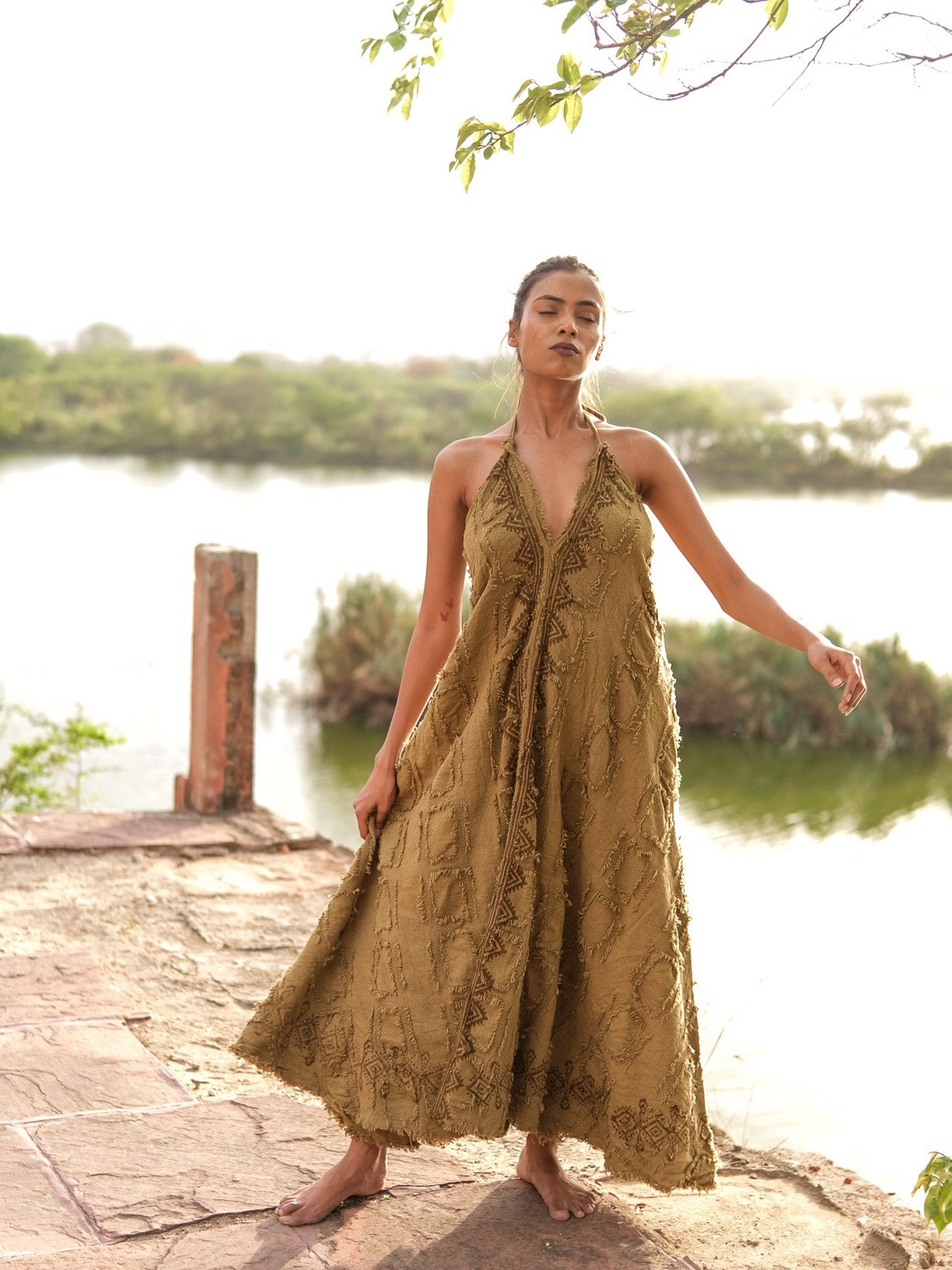 Introducing the Devina Maxi Dress. Made from premium quality fabric, its elegant design features a unique block print and soft, comfortable fryed fabric. Perfect for creating a boho look and gracing your beauty. Elevate your style with this must-have piece.