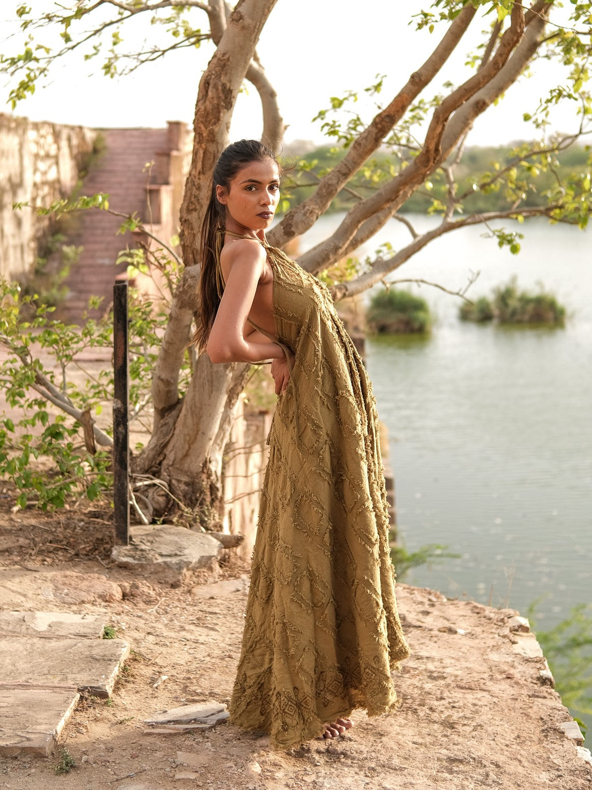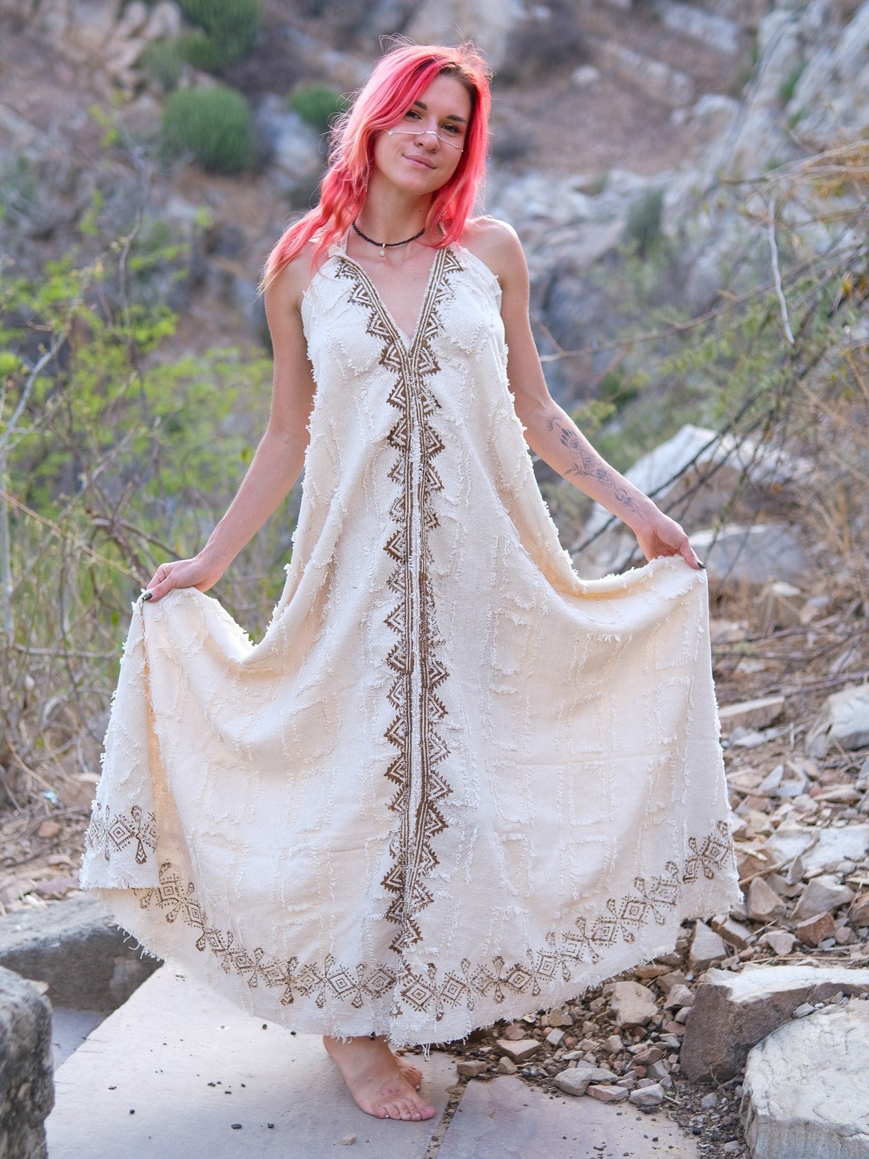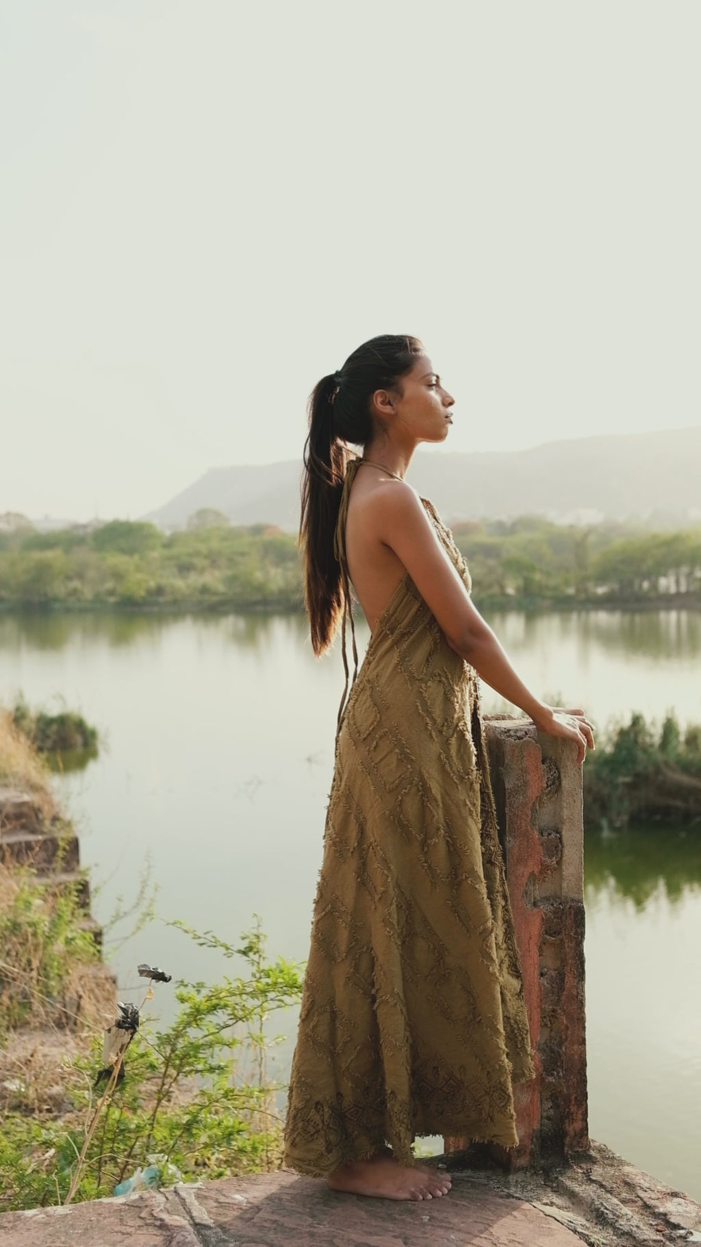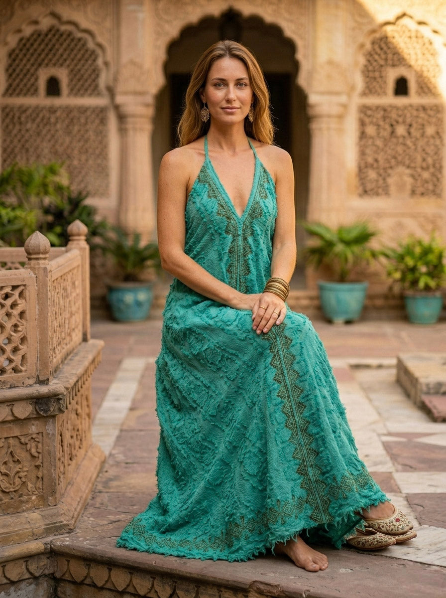 Introducing the Devina Maxi Dress. Made from premium quality fabric, its elegant design features a unique block print and soft, comfortable fryed fabric. Perfect for creating a boho look and gracing your beauty. Elevate your style with this must-have piece.