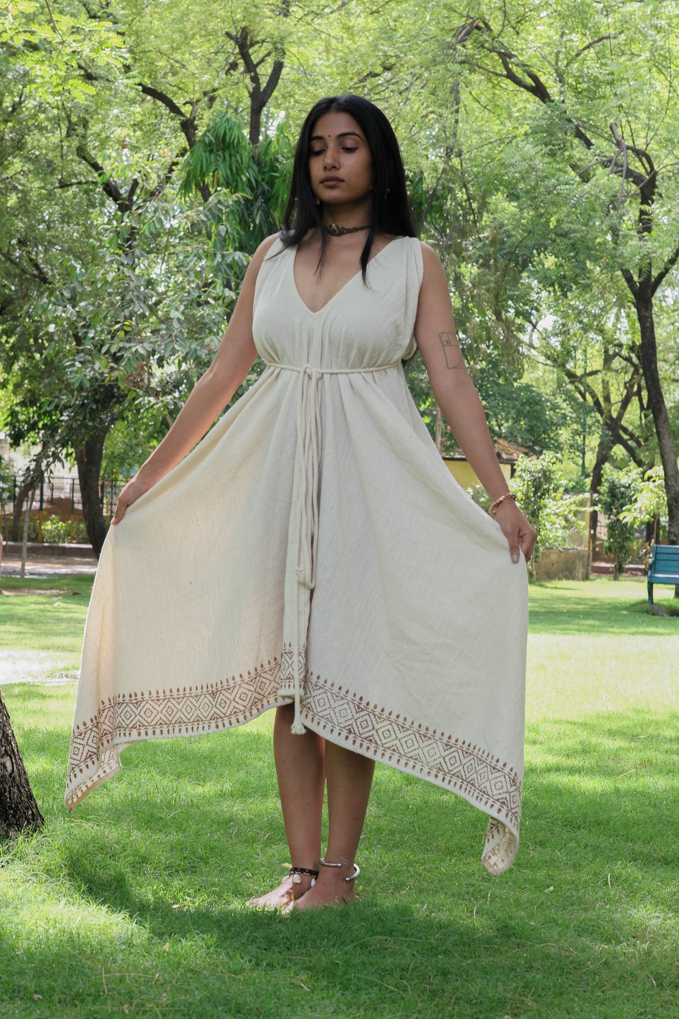 Get ready to turn heads in the Gauri Maxi Dress! This unique dress features a trendy v-neck and minimal block print, giving it a boho vibe. Its free size and element attached rope make it stand out from the rest. Embrace your individuality and style with this natural-colored dress.