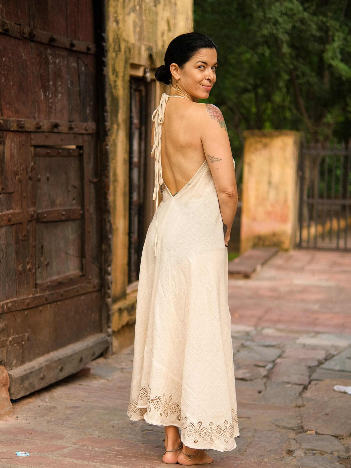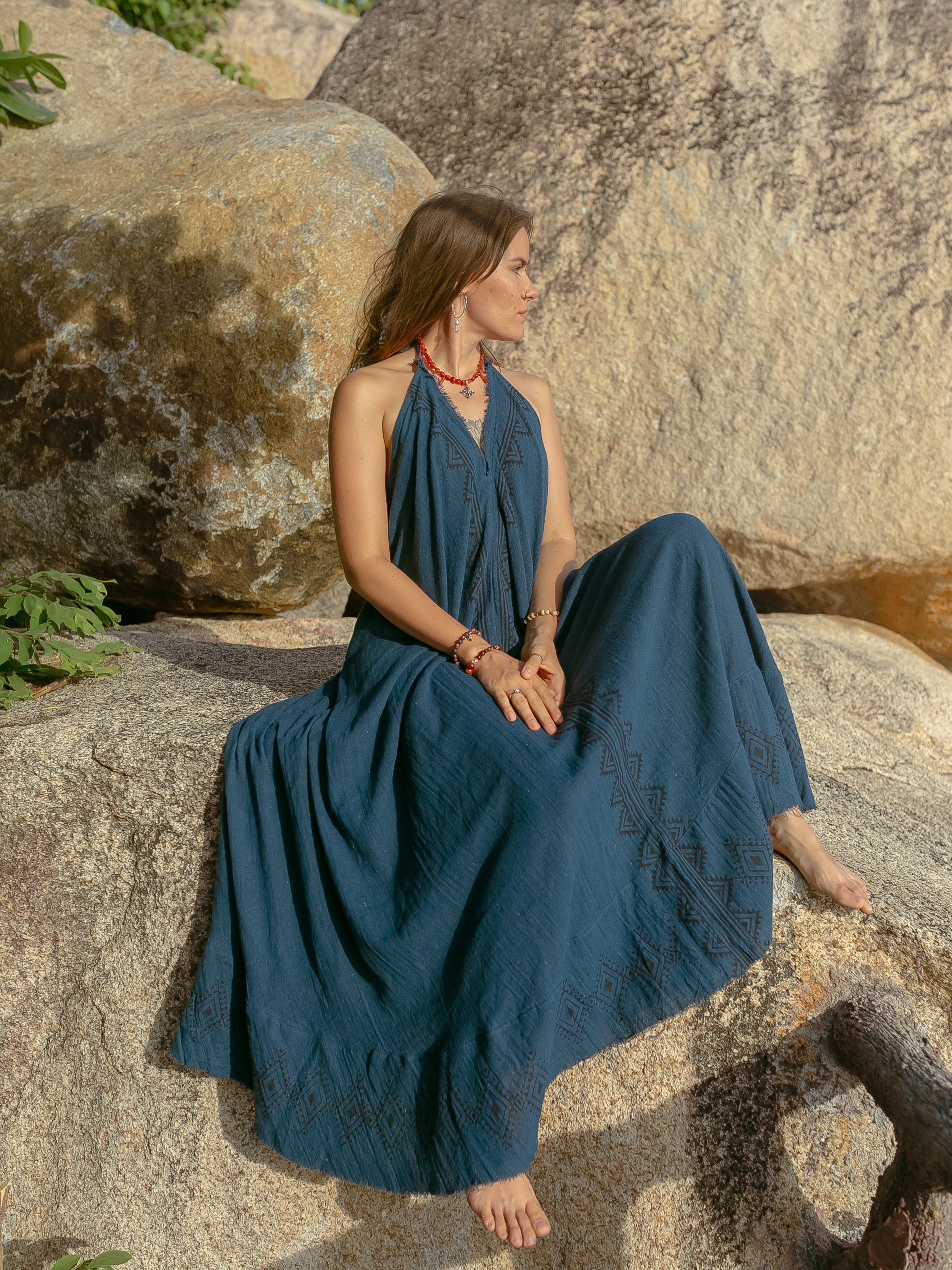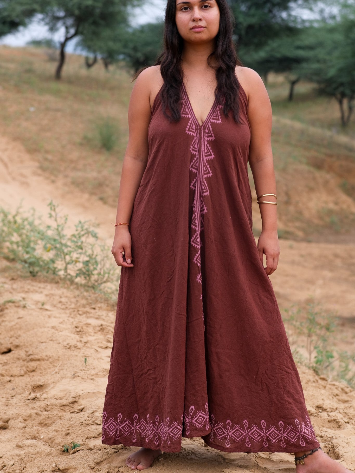 Introducing the Hanvi maxi dress, made from sustainable cotton fabric. This elegant design features a unique block print on the front and bottom of the dress. Bring some eco-friendly fashion to your wardrobe and stand out from the crowd with Hanvi!