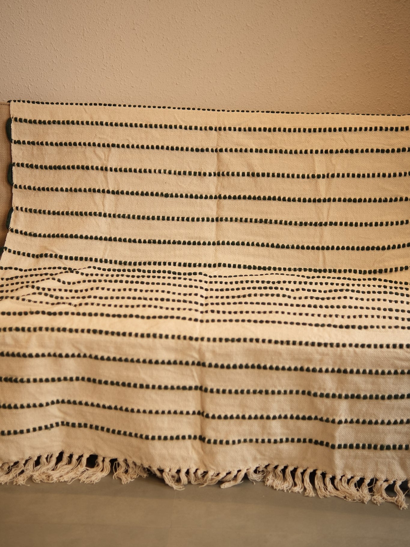 Elevate your living space with the Aadhya Handwoven Striped Cotton Sofa Throw, crafted in soft, breathable cotton and decorated with minimalist black dotted stripes. Its clean, modern aesthetic blends effortlessly with boho, contemporary, and earthy home décor styles. Each piece is traditionally woven with fine craftsmanship, creating subtle texture and outstanding durability.