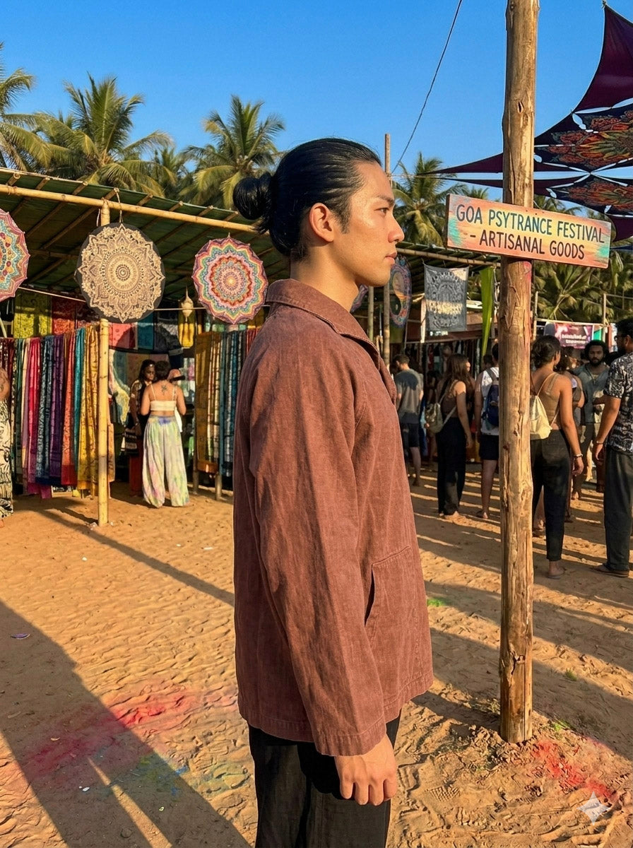 Crafted from durable V-twill fabric, this jacket offers a perfect balance of comfort and structure. The relaxed silhouette and earthy tone give it a timeless, effortless look inspired by nomadic and festival style. Designed with a wide collar and practical front pockets, it is ideal for layering in cooler weather while maintaining a casual, laid-back aesthetic. The breathable fabric and clean stitching make it suitable for everyday wear as well as travel and outdoor gatherings.