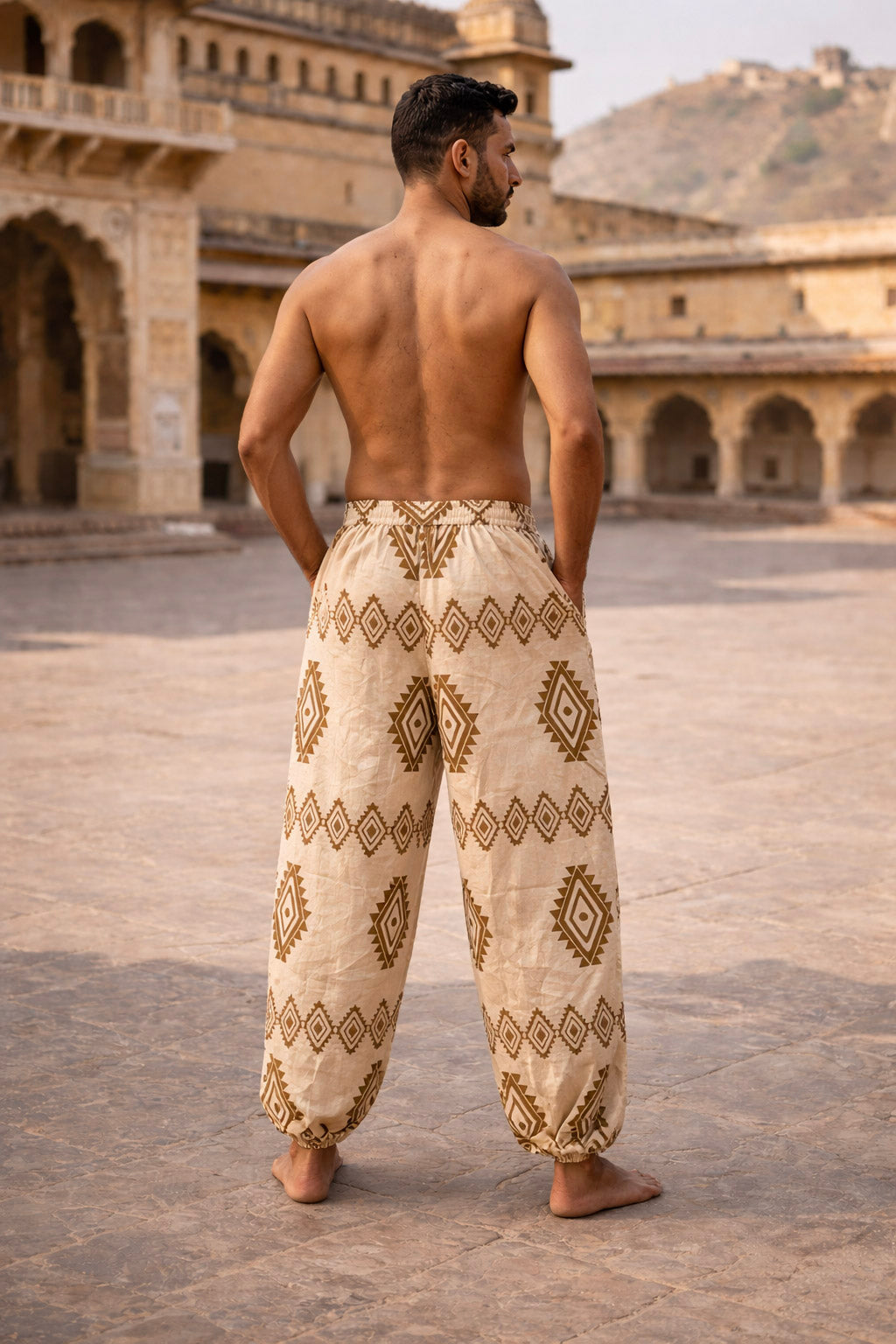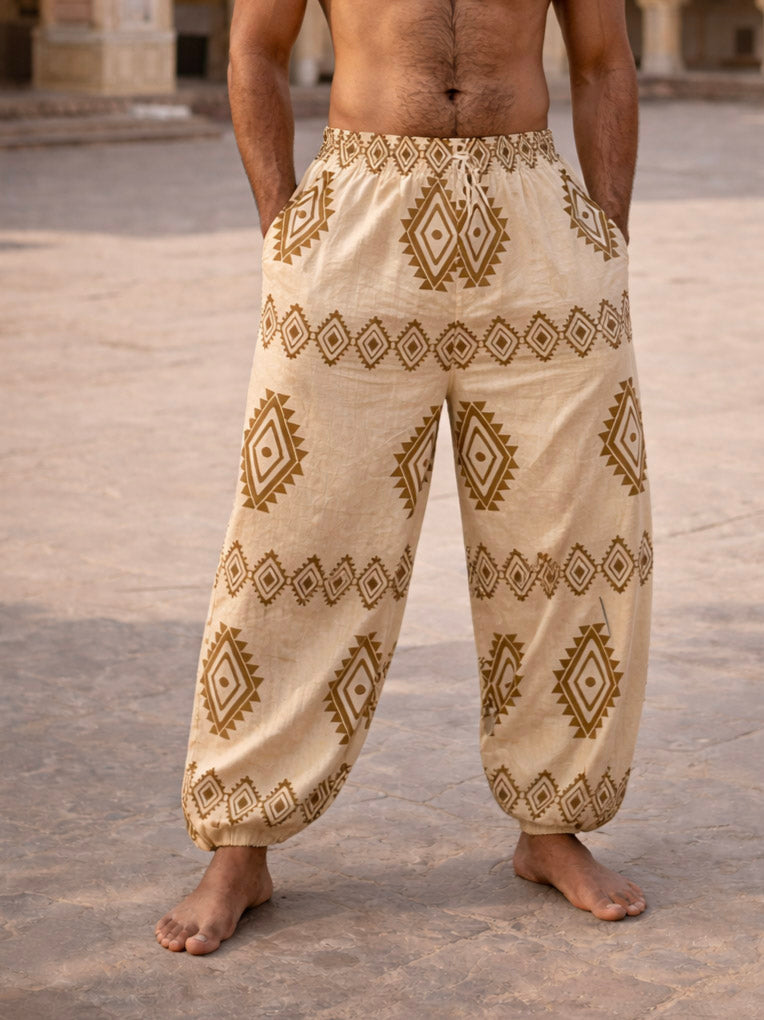 These harem pants offer a relaxed, baggy fit with a stretchy waistband and gathered ankles for a classic bohemian look. The fabric is covered in a detailed ethnic pattern featuring tribal and geometric shapes. With deep side pockets and a breezy design, they are a comfortable and stylish choice for casual wear or beach trips.