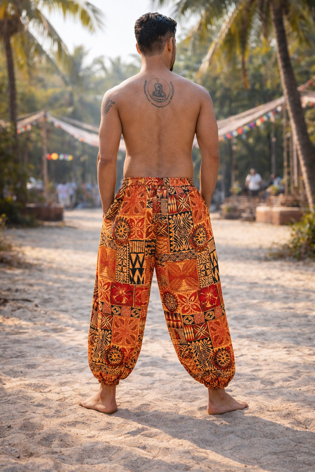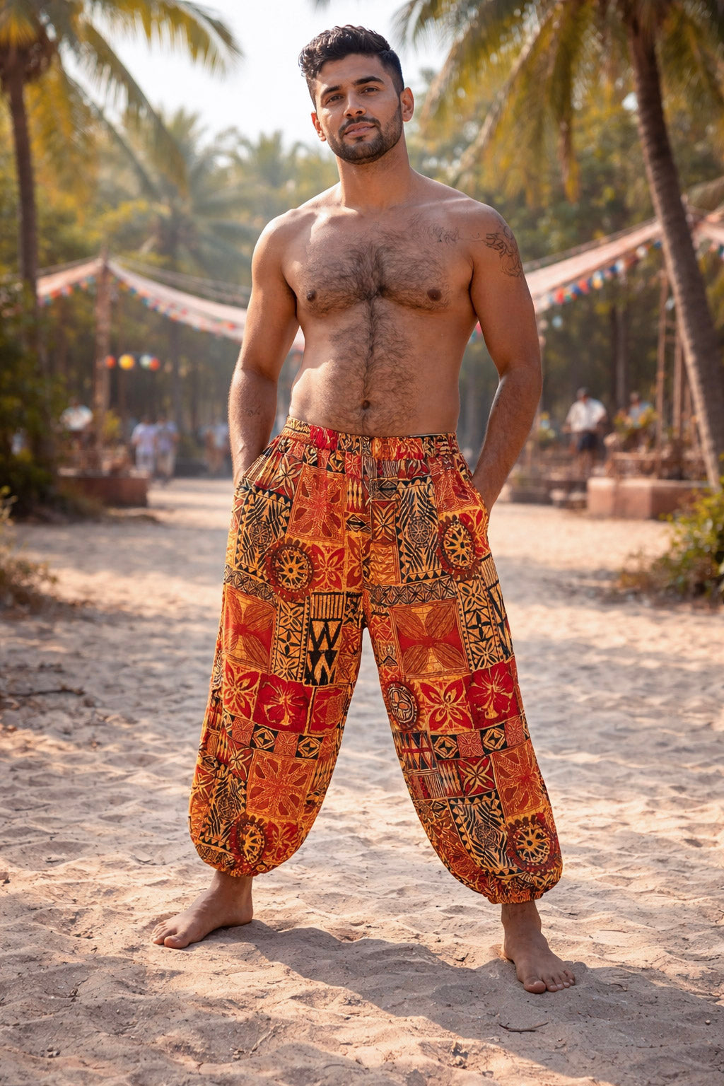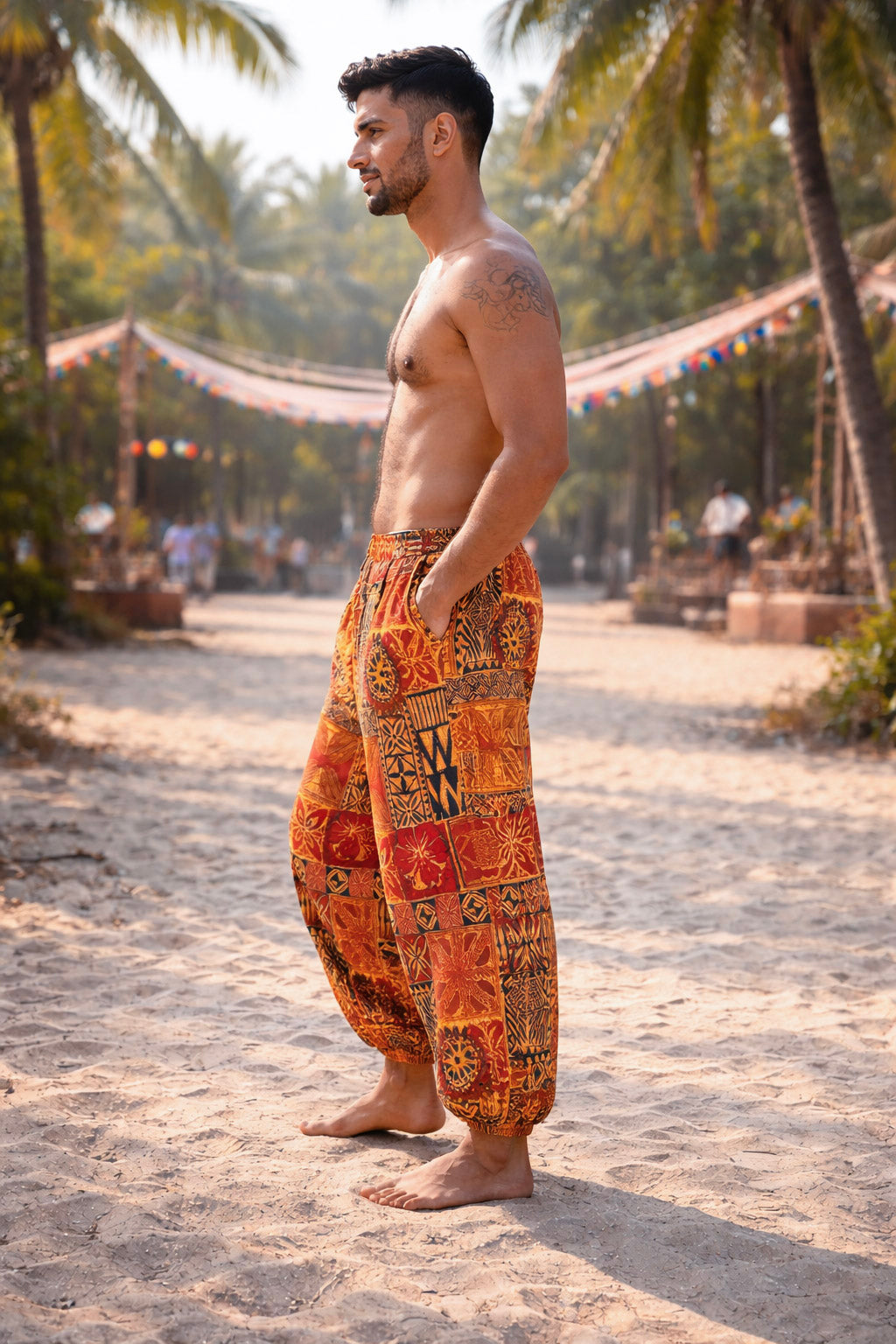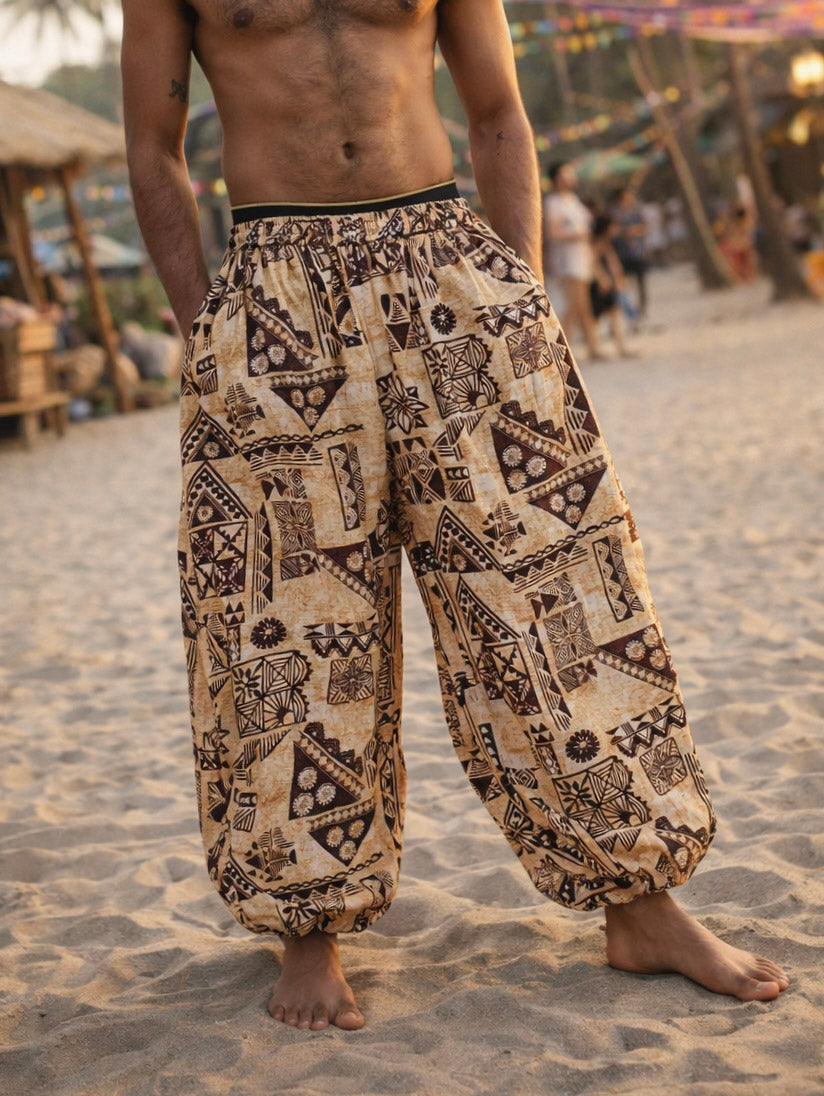 These harem pants offer a relaxed, baggy fit with a stretchy waistband and gathered ankles for a classic bohemian look. The fabric is covered in a detailed ethnic pattern featuring tribal and geometric shapes. With deep side pockets and a breezy design, they are a comfortable and stylish choice for casual wear or beach trips.
