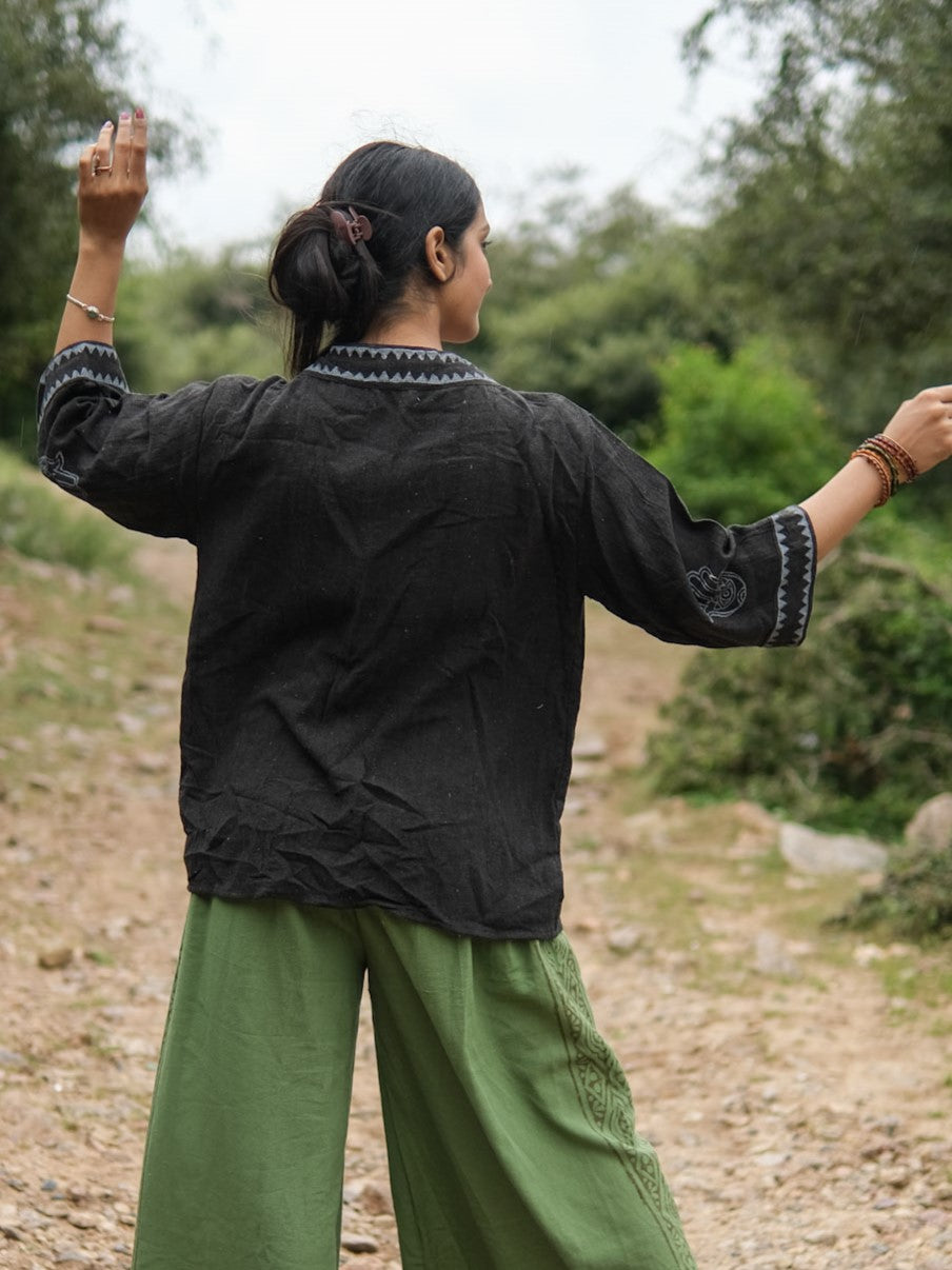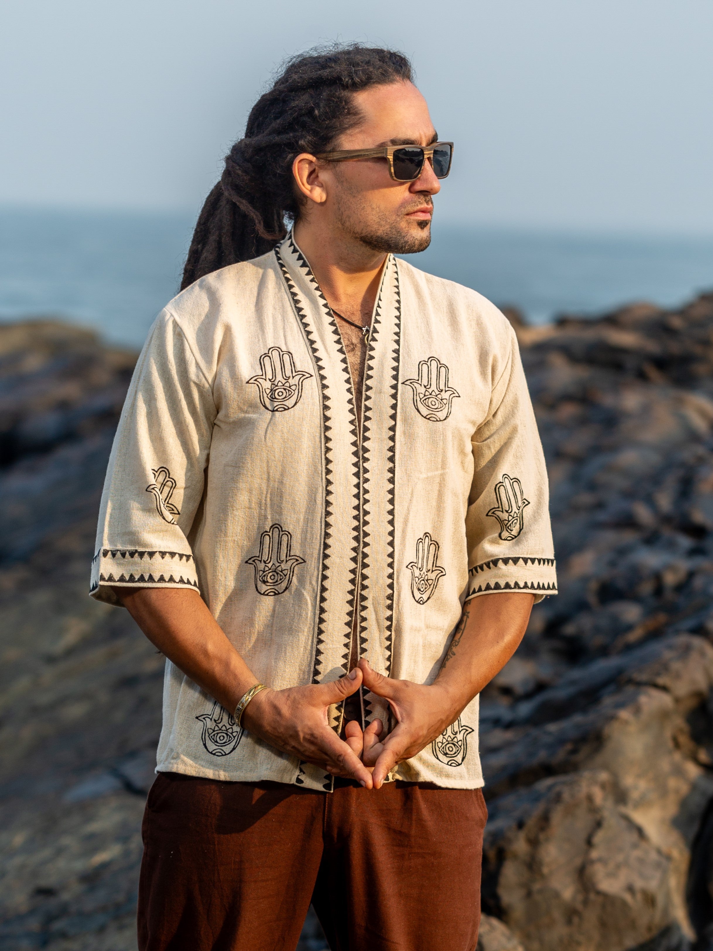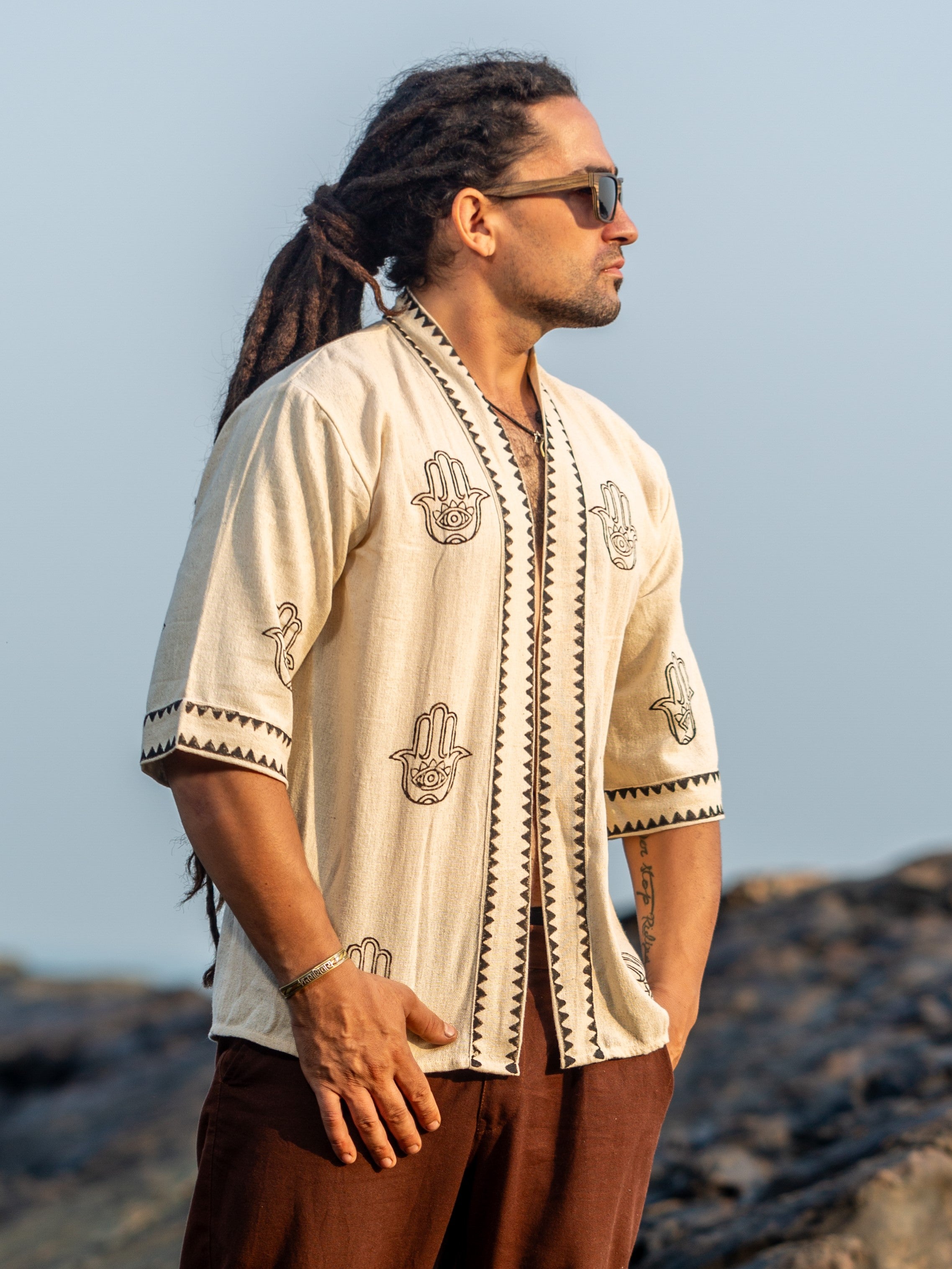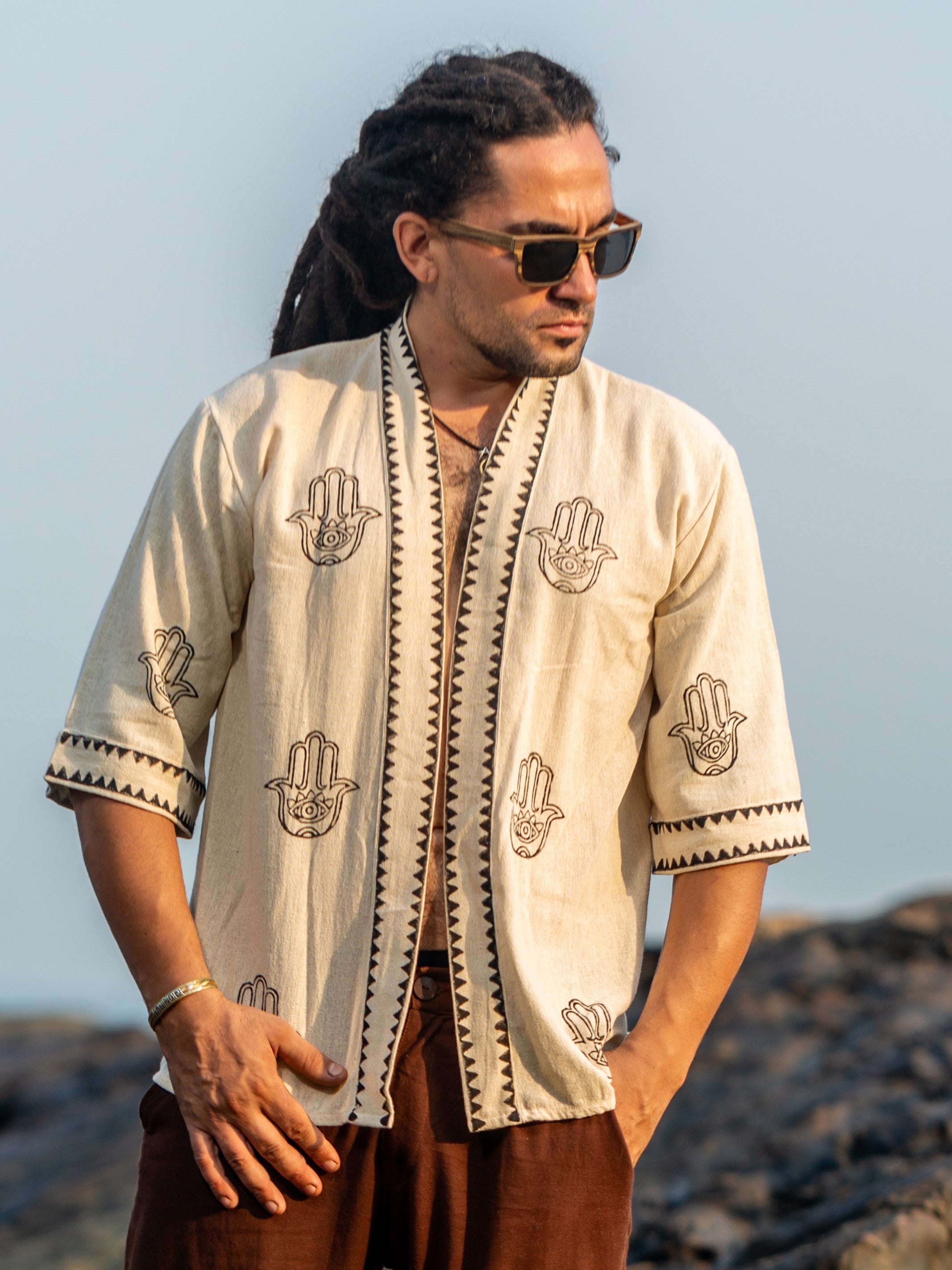 Introducing the Hamsa Kimono - our new design featuring a unique block print. This versatile and durable piece can be used as a shrug or a cover-up, handmade with a beautiful block print that adds a touch of creativity to your summer wardrobe. Perfect for creating a new boho look that is truly one-of-a-kind. (Limited stock available!)