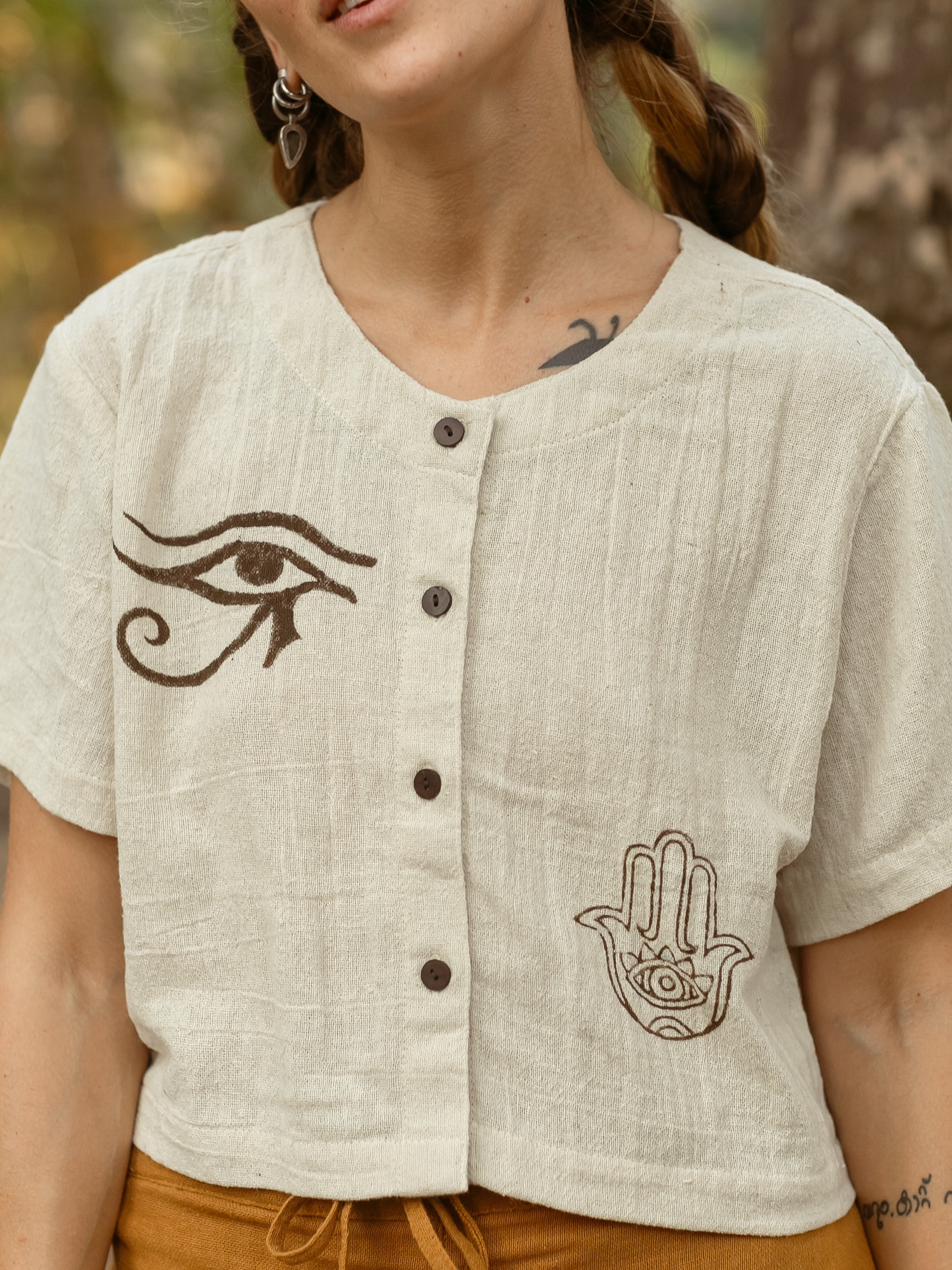 Upgrade your wardrobe with our Mars Crop Shirt. The unique block print adds a touch of fun, while the comfortable fabric ensures you'll never want to take it off. Say goodbye to boring shirts and hello to quirky style!