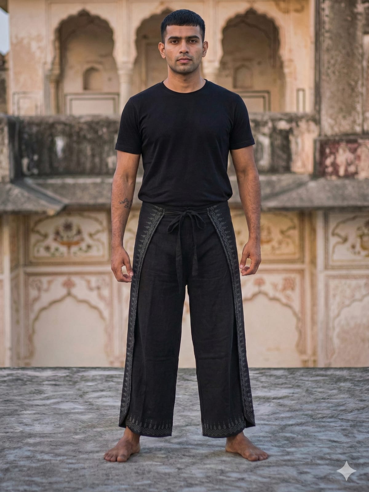 Discover the perfect combination of comfort, culture, and style with these Thai wrap pants! Crafted from premium cotton fabric, they accommodate up to a 36-inch waist while their unique Thai style and bohemian-inspired look make them a perfect unisex piece. Lined with beautiful blockprint borders, these pants add a touch of allure and freedom of movement that will have you feeling elegant and exotic. Experience the epitome of cultural appreciation!